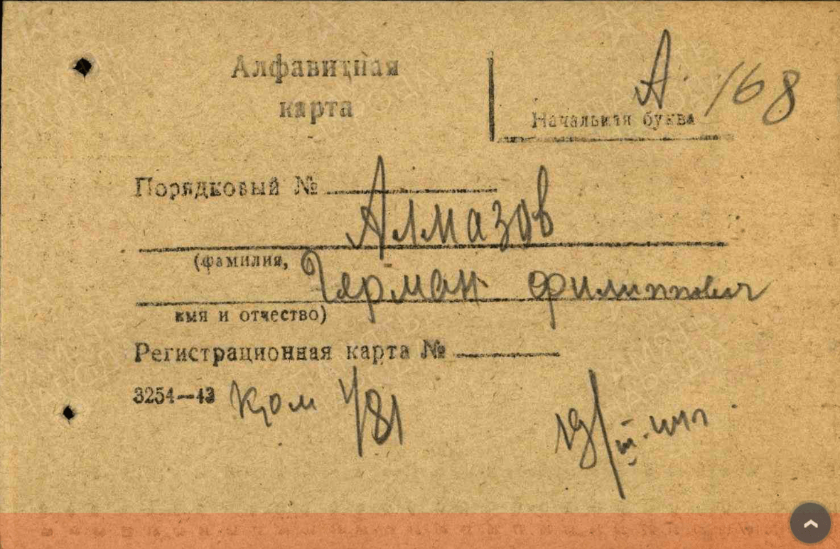 Уроженец г. Сарапула Алмазов Герман Филиппович был призван в ряды РККА Сарапульским военкоматом. По данным военно-пересыльных пунктов и запасных полков, Герман Филиппович 18 марта 1944 года из Сарапула был направлен в республиканский пересыльный пункт в село Малая Пурга. 25 марта 1944 года выбыл из Малой Пурги в распоряжение директора завода № 78 им. Серго Орджоникидзе в г. Челябинск. В годы Великой Отечественной войны завод выпускал корпуса и башни для танков, боеприпасы, производил ремонт подбитой военной техники.