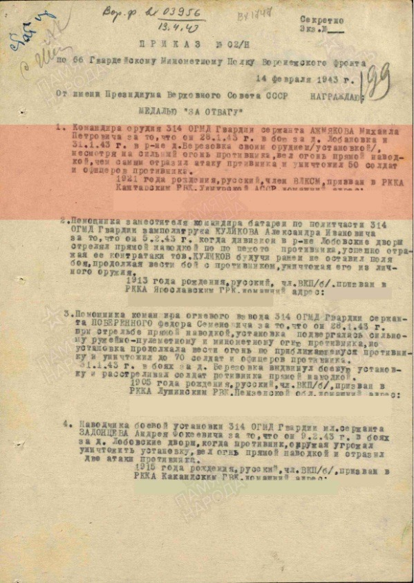 Выписка из приказа командующего Воронежским фронтом от 13.03.1943 г.: «Наградить медалью «За отвагу» гвардии сержанта Ажмякова Михаила Петровича за то, что он 28.01.43 г. в бою за д. Лобановка и 31.1.43 г. в бою за д. Березовка своим орудием/ установкой/, несмотря на сильный огонь противника, вел огонь прямой наводкой, тем самым отразил атаку противника и уничтожил 50 солдат и офицеров противника».