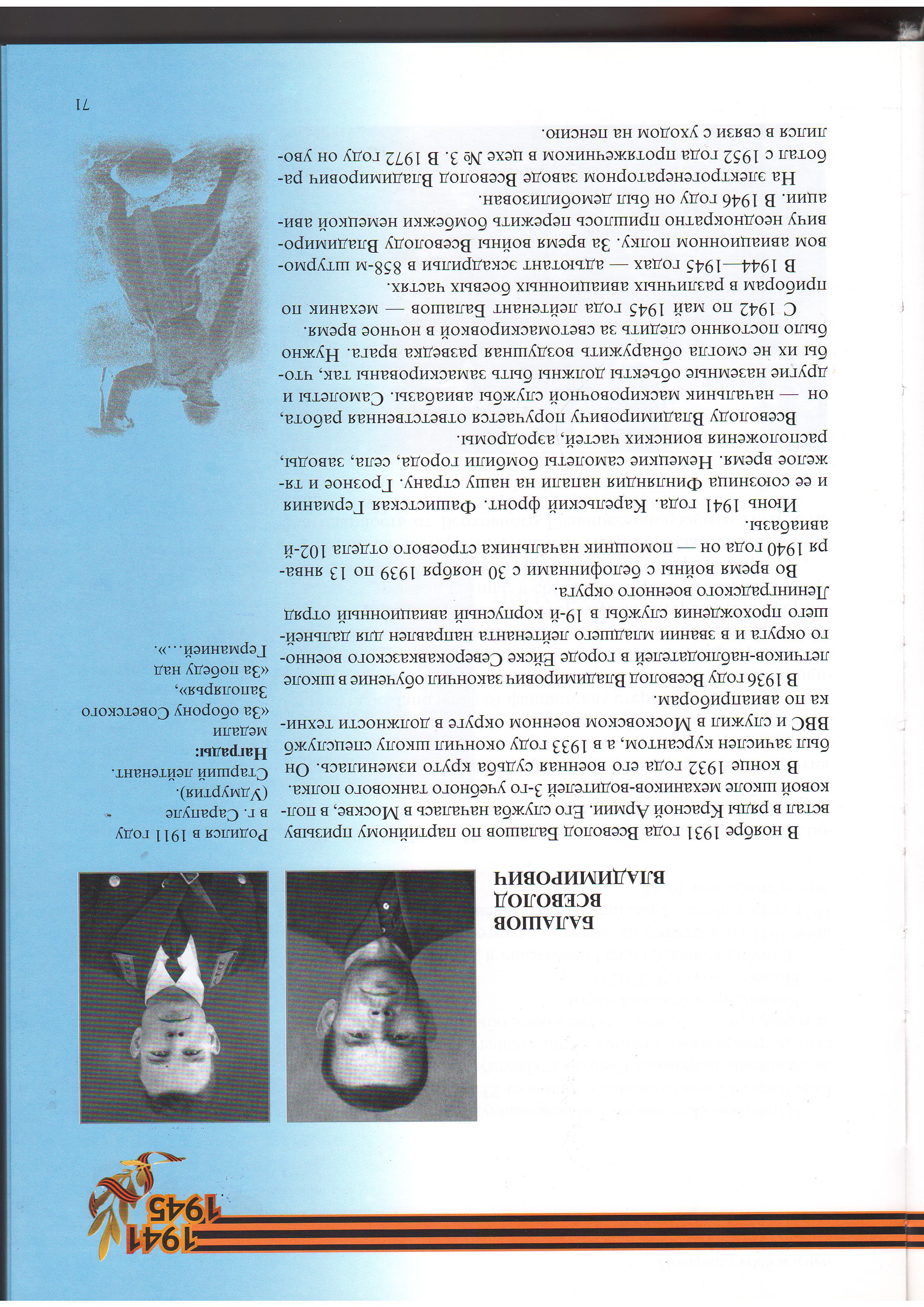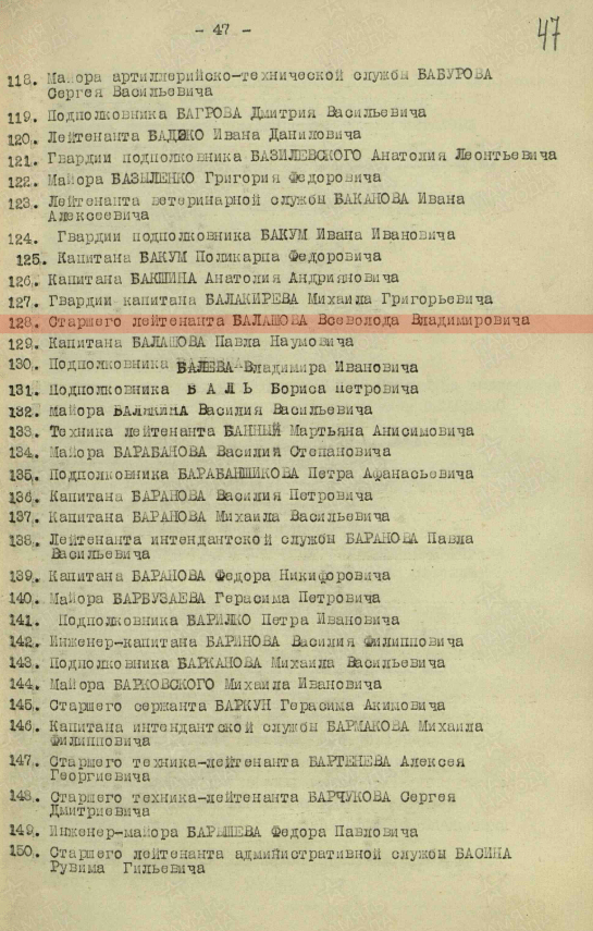 Уроженец г. Сарапула Балашов Всеволод Владимирович в ноябре 1931 года по партийному призыву встал в ряды Красной Армии. Его служба началась в Москве, в полковой школе механиков-водителей 3-го учебного танкового полка. В конце 1932 года был зачислен курсантом в школу спецслужб ВВС, которую окончил в 1933 году. Служил в Московском военном округе в должности техника по авиаприборам. В 1936 году закончил обучение в школе лётчиков-наблюдателей в г. Ейске Северокавказского военного округа и в звании младшего лейтенанта был направлен на службу в 19-й корпусный авиационный отряд Ленинградского военного округа. Во время войны с белофиннами с 30 ноября 1939 по 13 января 1940 года он – помощник начальника строевого отдела 102-й авиабазы. В Отечественной войне с июня 1941 года. Воевал на Карельском фронте в должности начальника маскировочной службы авиабазы. С 1942 по май 1945 года лейтенант Балашов – механик по приборам в различных авиационных боевых частях. В 1944-1945гг. – адъютант эскадрильи в 858-м штурмовом авиационном полку. Демобилизован в 1946 году.