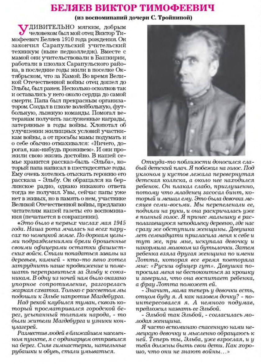 Виктор Тимофеевич Беляев родился в г. Сарапуле в 1910 году. До войны окончил Сарапульский педагогический техникум, работал учителем в Башкирии, в школах Сарапульского района. Призван в армию в 1941 г. (по другим сведениям – в 1942 г.).