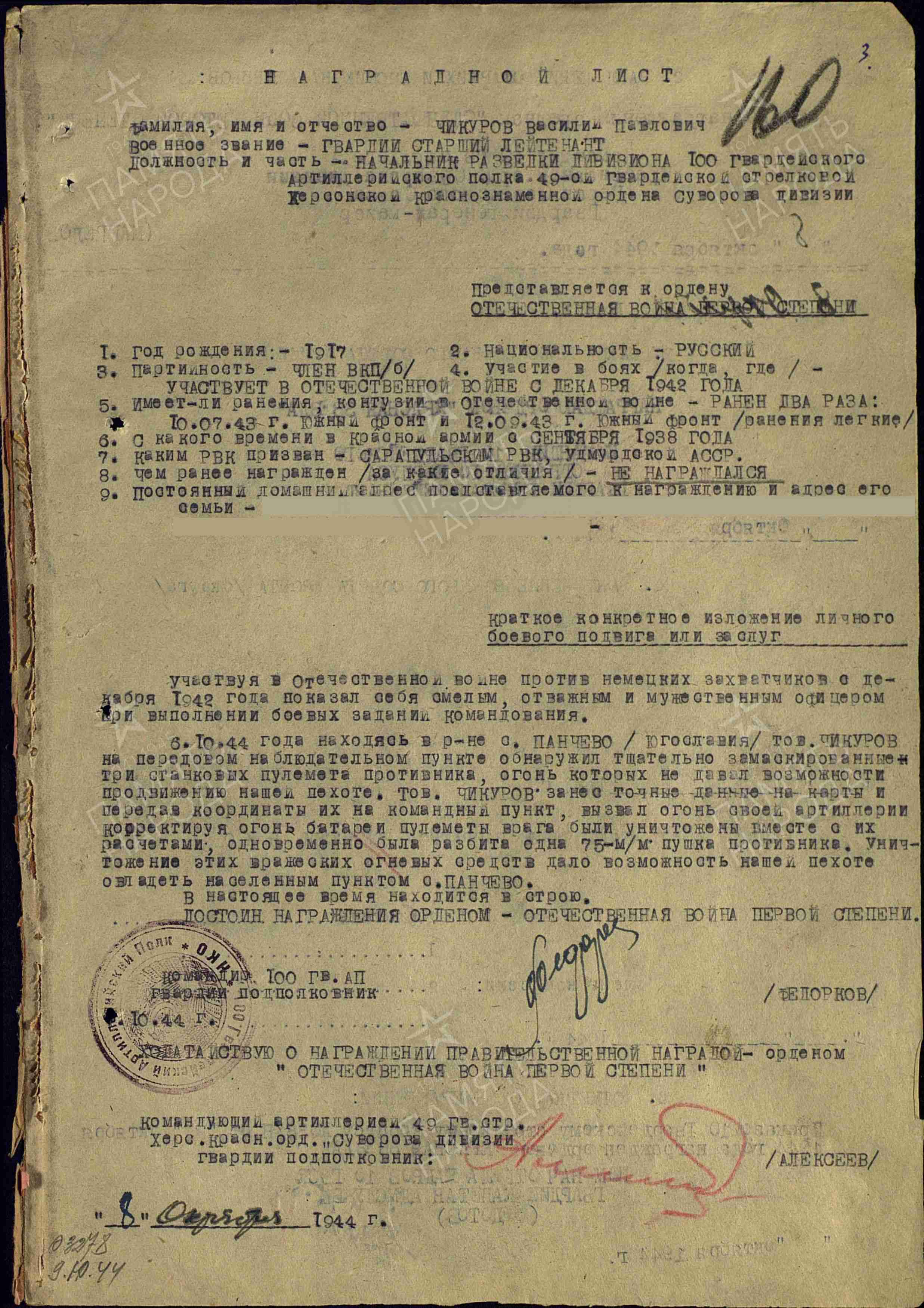 Уроженец г. Сарапула Василий Павлович Чикуров в 1938 году был призван в ряды РККА. Служил на Дальнем Востоке. Был направлен в Хабаровск в военное артиллерийское училище, досрочно получил звание лейтенанта.