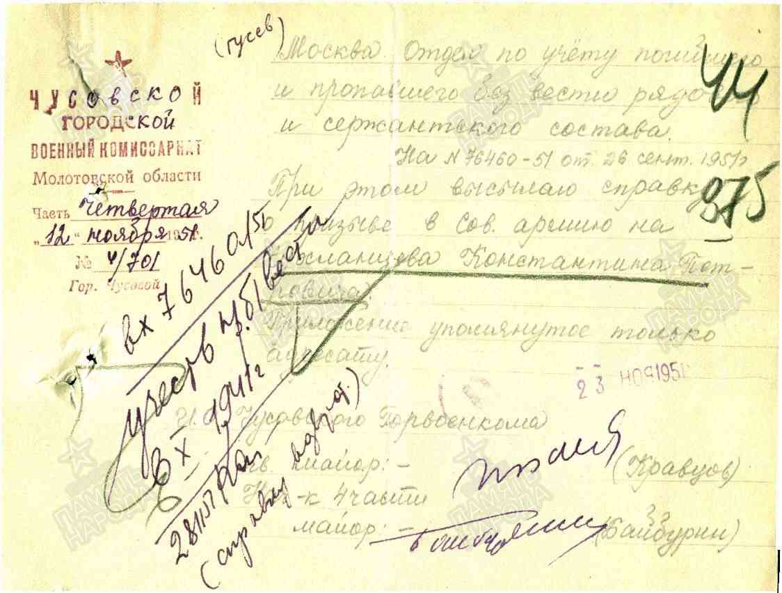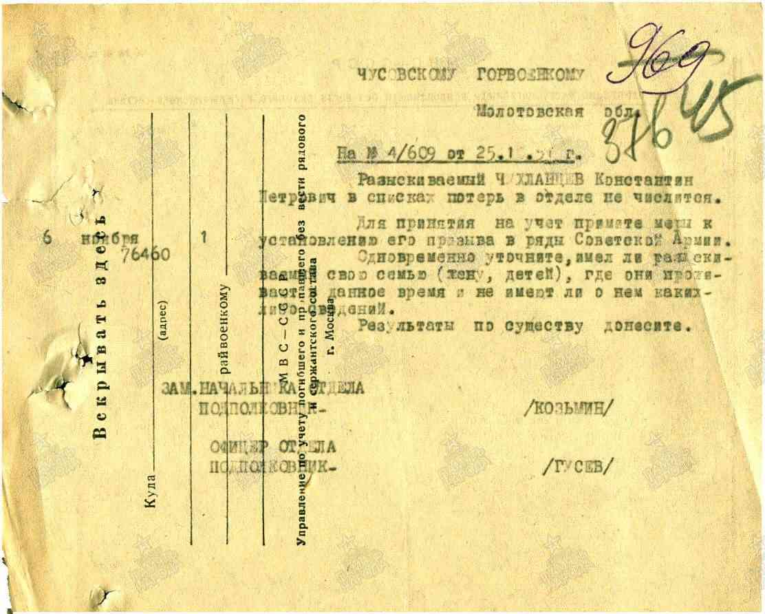 По данным ГКУ «Центральный государственный архив Удмуртской Республики», Константин Петрович Чухланцев попал в плен, был освобожден и направлен в фильтрационный лагерь для проверки (фильтрационно-проверочное дело за 1940-1955 годы). Дальнейшая судьба неизвестна.