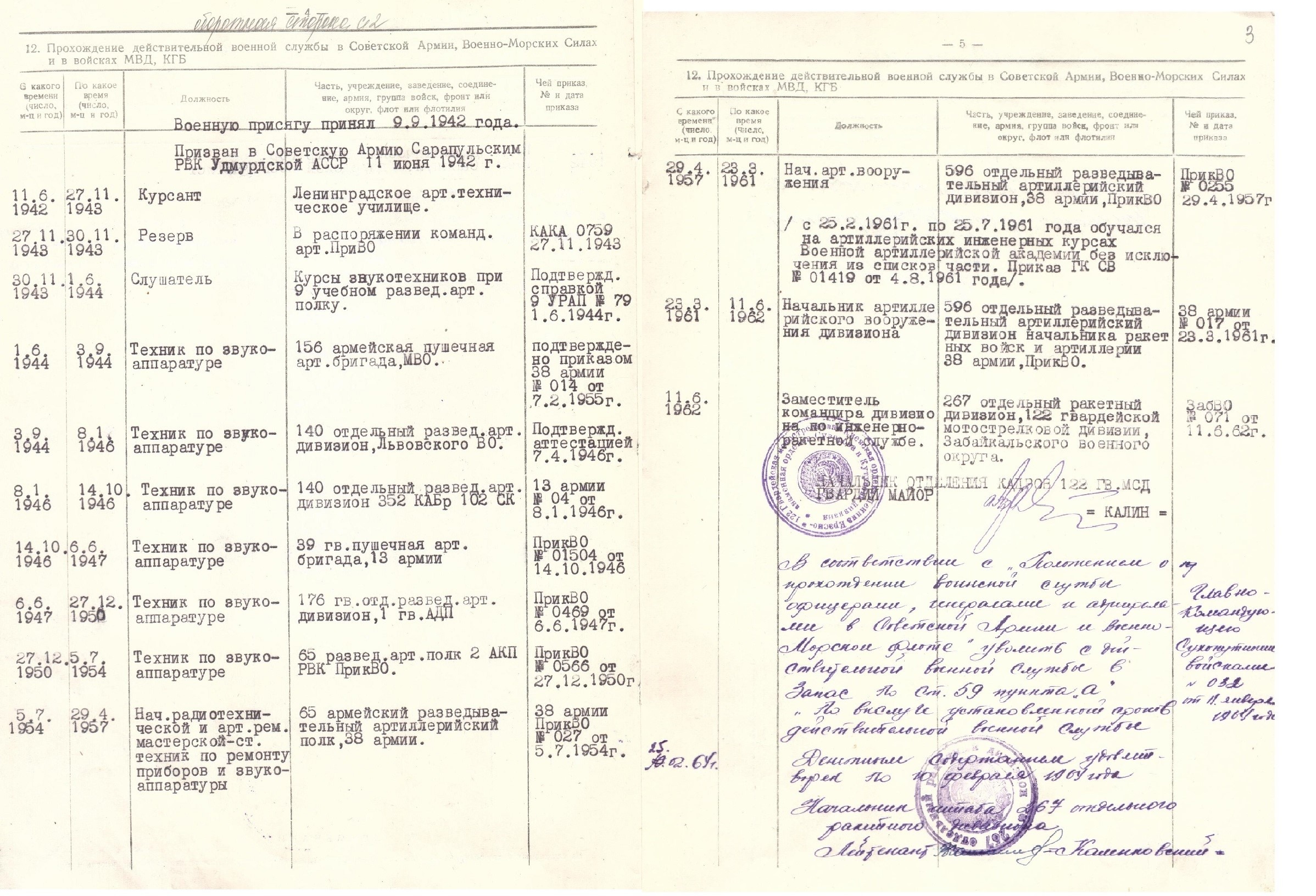 Место службы: 156 армейская пушечная артиллерийская бригада, Львовский военный округ; 140 отдельный разведывательный артиллерийский дивизион, 352 кавалерийская бригада; 102 стрелковый корпус, 39 гвардейская пушечная артиллерийская бригада, 13 армия; 176 гвардейский отдельный разведывательный дивизион