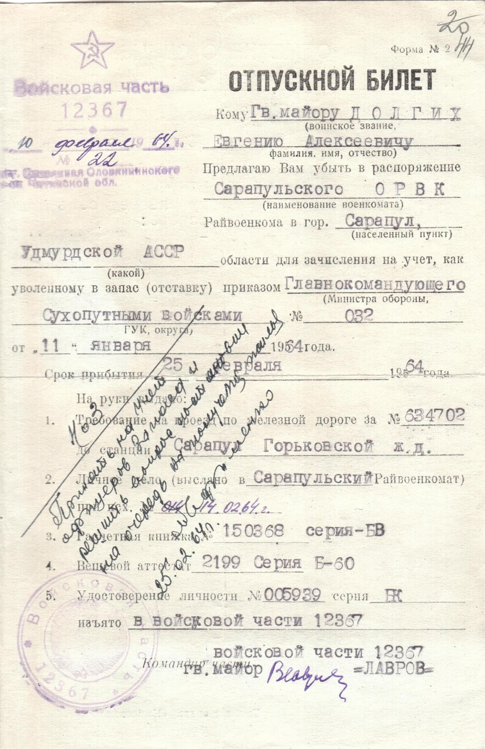 Уроженец г. Сарапула Долгих Евгений Алексеевич родился в семье служащих. В 1941 году после окончания 9 классов был принят курсантом в Сарапульский аэроклуб, который окончил в феврале 1942 года. Работал в драматическом театре, параллельно окончил заочно 10 классов средней школы. В июне 1942 года был направлен в Ленинградское артиллерийско-техническое училище эвакуированное в г. Ижевск, после окончания которого в октябре 1943 года направлен на курсы звукотехников в 9-й учебный разведывательный артиллерийский полк г. Саранска. После окончания курсов получил назначение в разведывательный артиллерийский дивизион 156-й армейской пушечной артиллерийской бригады в г. Богородицк на должность техника по звукоаппаратуре. В октябре 1944 года бригада передислоцировалась в г. Волчанск Харьковской области, дивизион был выведен из состава бригады и перешёл в распоряжение Волчанского учебного артлагеря.