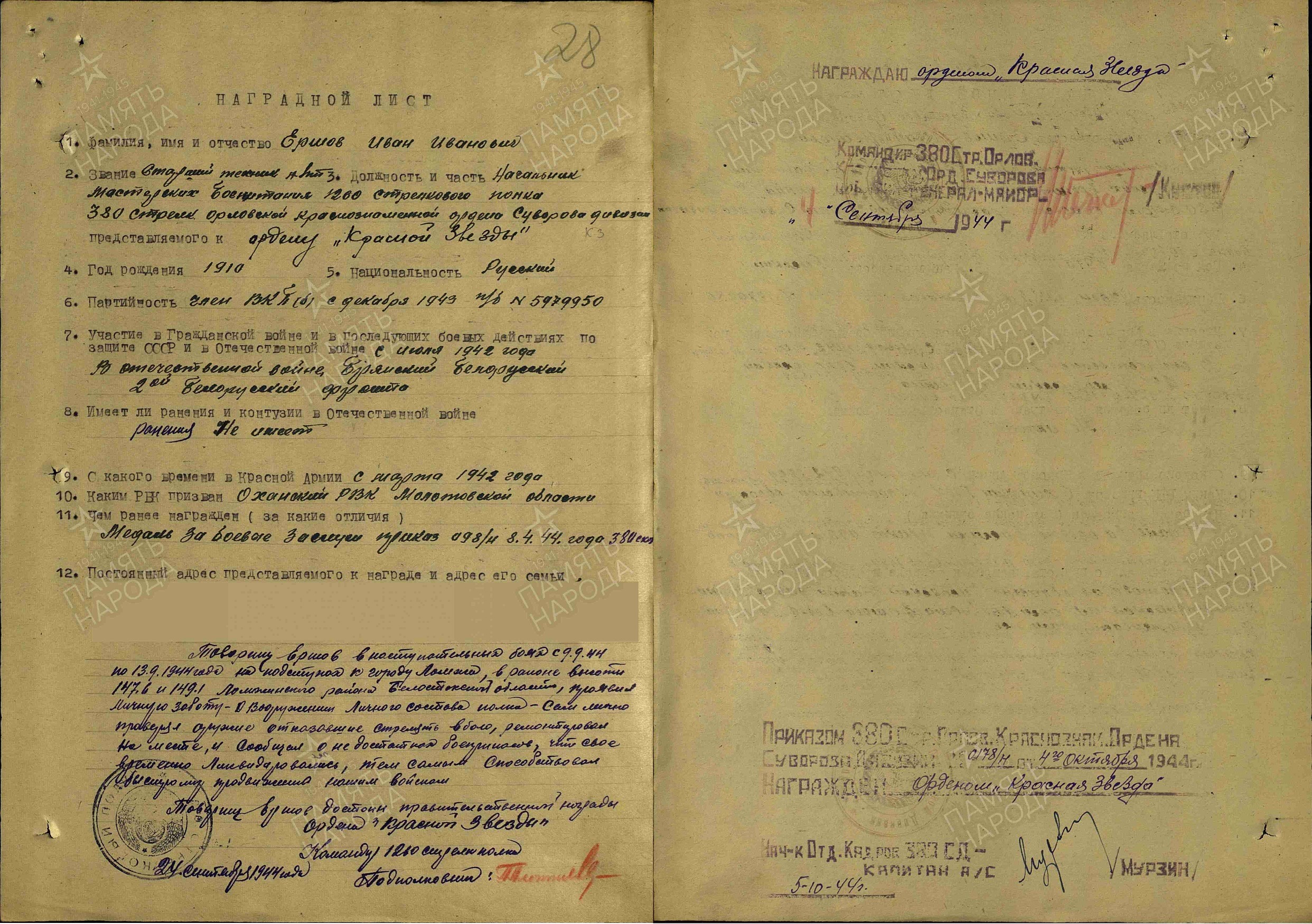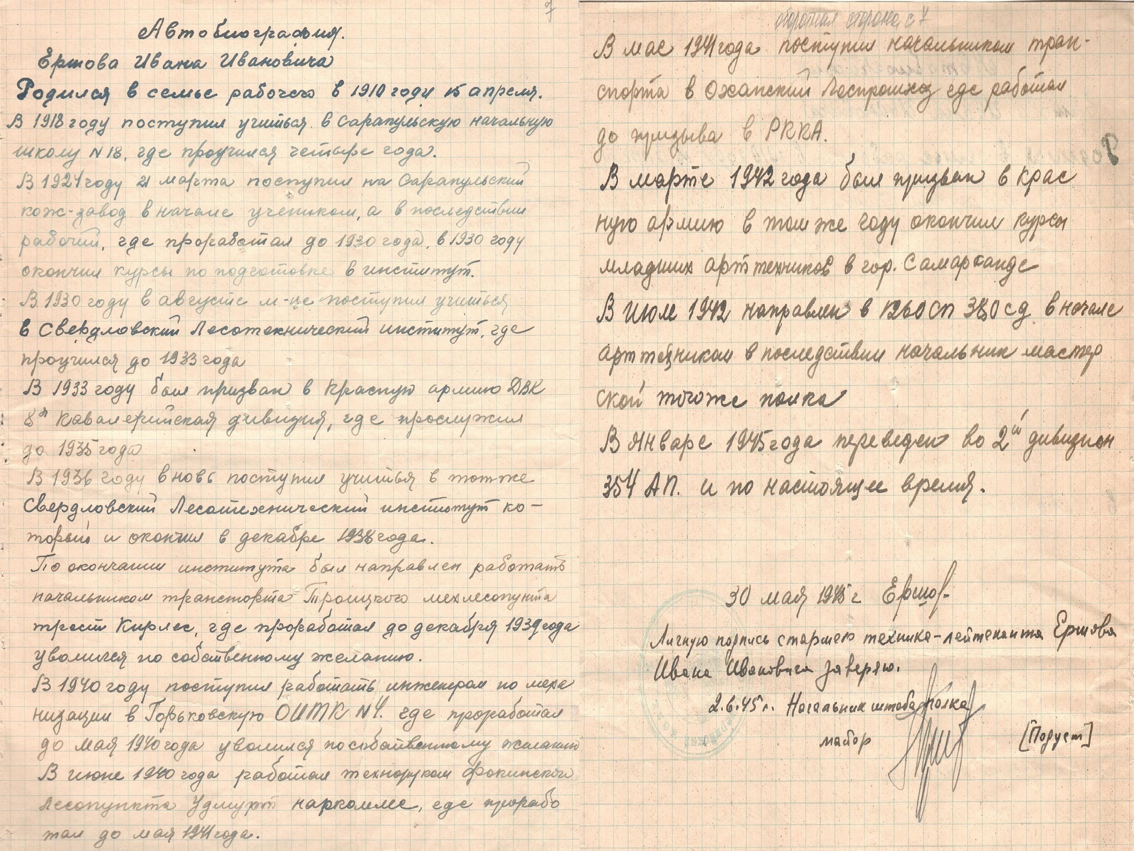 Уроженец г. Сарапула Ершов Иван Иванович в 1918 году поступил учиться в школу № 18, окончил четыре класса. В марте 1924 года поступил на Сарапульский кожевенный завод, сначала учеником, а затем рабочим, проработал до 1930 года. С августа 1930 по 1933 год – он студент Свердловского лесотехнического института. С 1933 по 1935 год служил в рядах РККА на Дальнем Востоке в 8-й кавалерийской дивизии. После службы возобновил учёбу. В декабре 1938 года окончил Свердловский лесотехнический институт и был направлен работать начальником транспорта Троицкого механического лесопункта. Затем работал инженером по механизации, техноруком Фокинского лесопункта, начальником транспорта.
