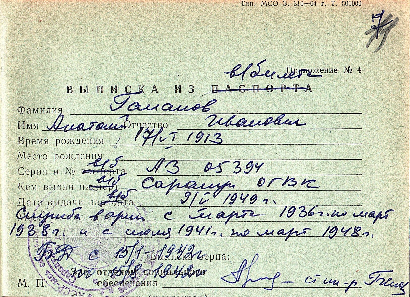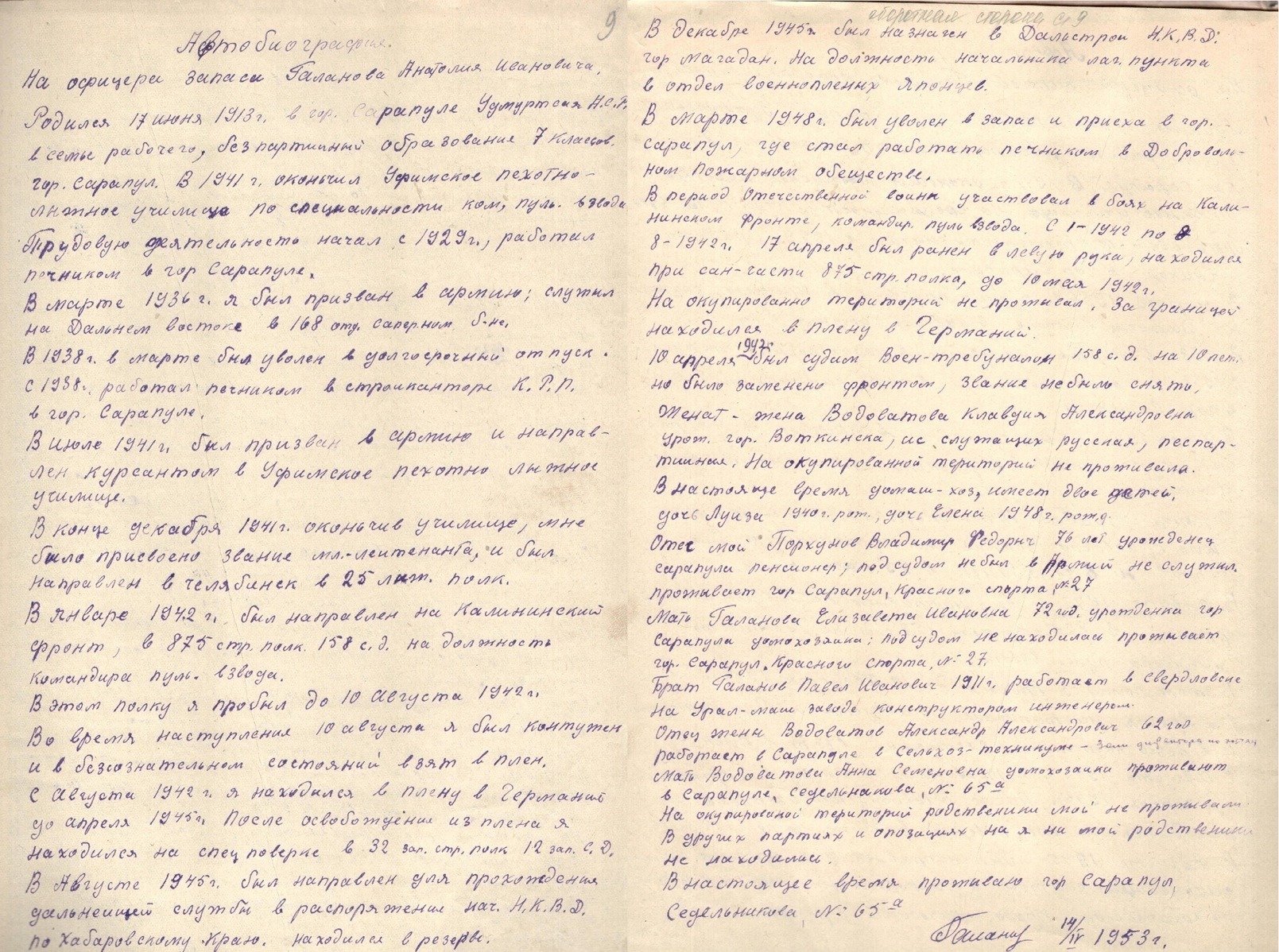 Уроженец г. Сарапула Галанов Анатолий Иванович родился в семье рабочего, окончил 7 классов школы. Трудовую деятельность начал с 1929 года, печником. В марте 1936 года был призван на срочную службу в РККА, служил на Дальнем Востоке в 168-м отдельном сапёрном батальоне до марта 1938 года. В 1938 году уволен в долгосрочный отпуск. Вернулся в Сарапул, работал печником в стройконторе.