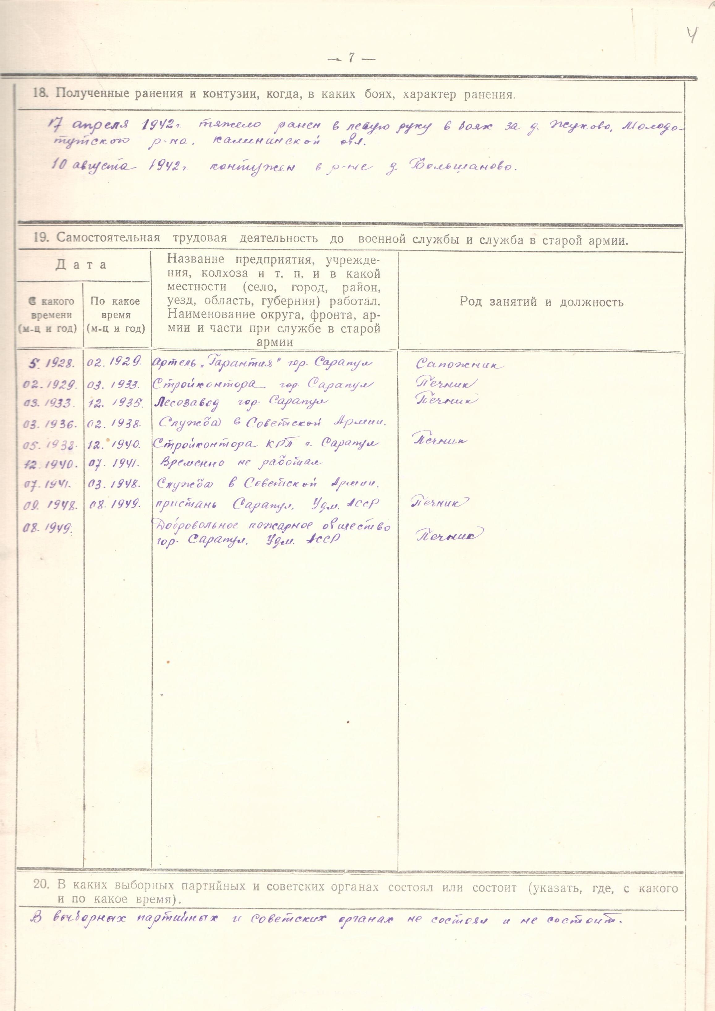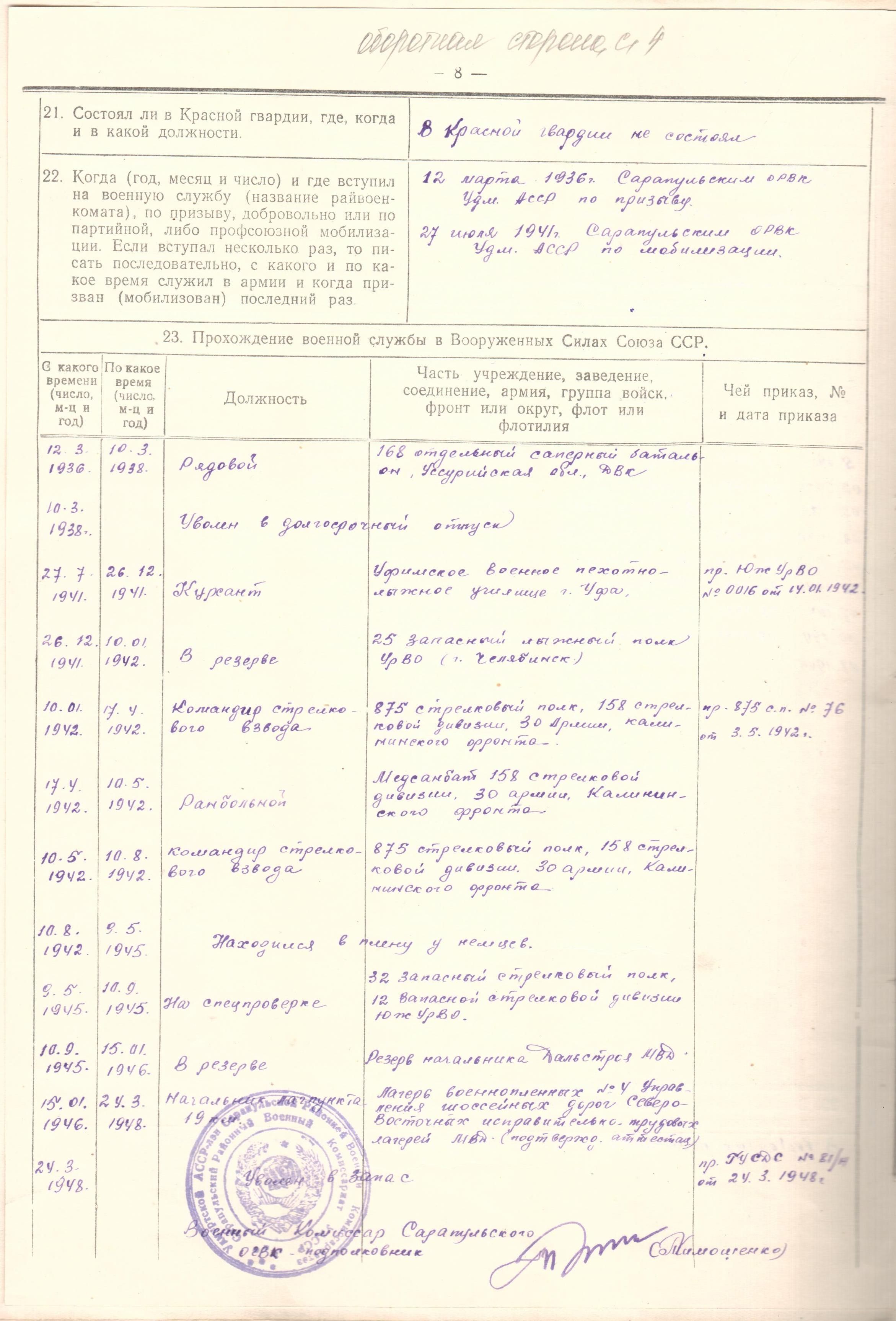 Место службы: 875 стрелковый полк, 881 стрелковый полк, 158 стрелковая дивизия, Уральский военный округ; 32 запасный стрелковый полк, 21 запасная стрелковая бригада, 12 запасная стрелковая дивизия, Калининский фронт