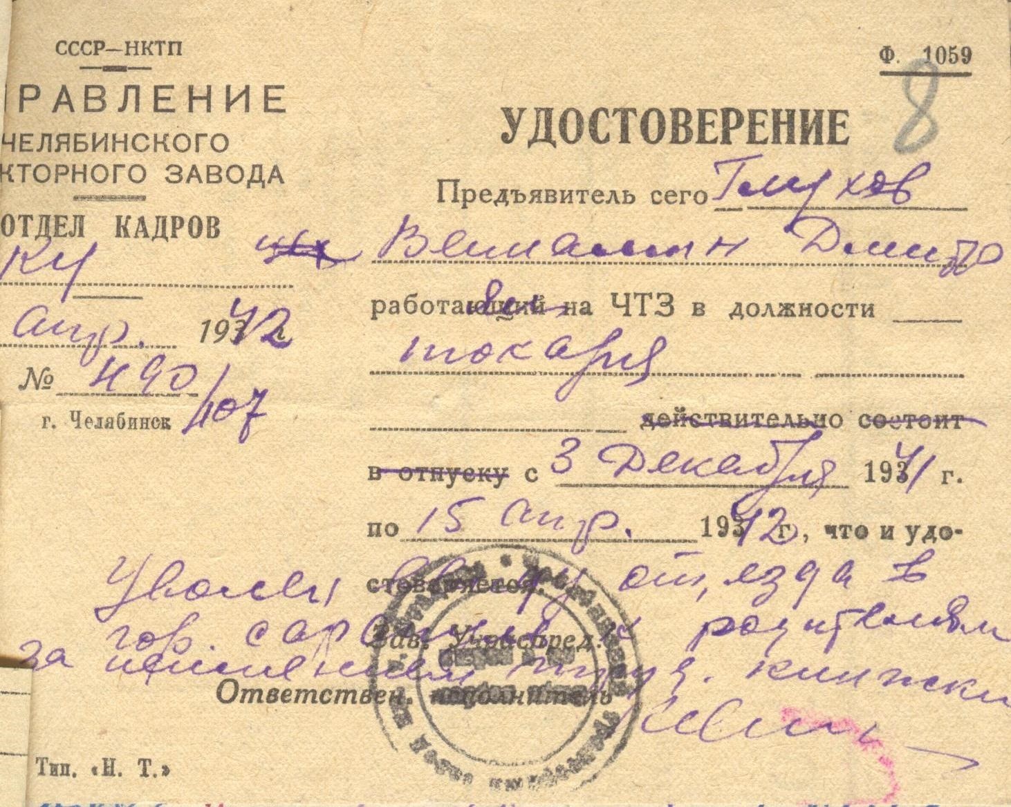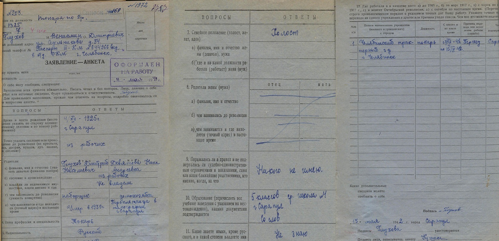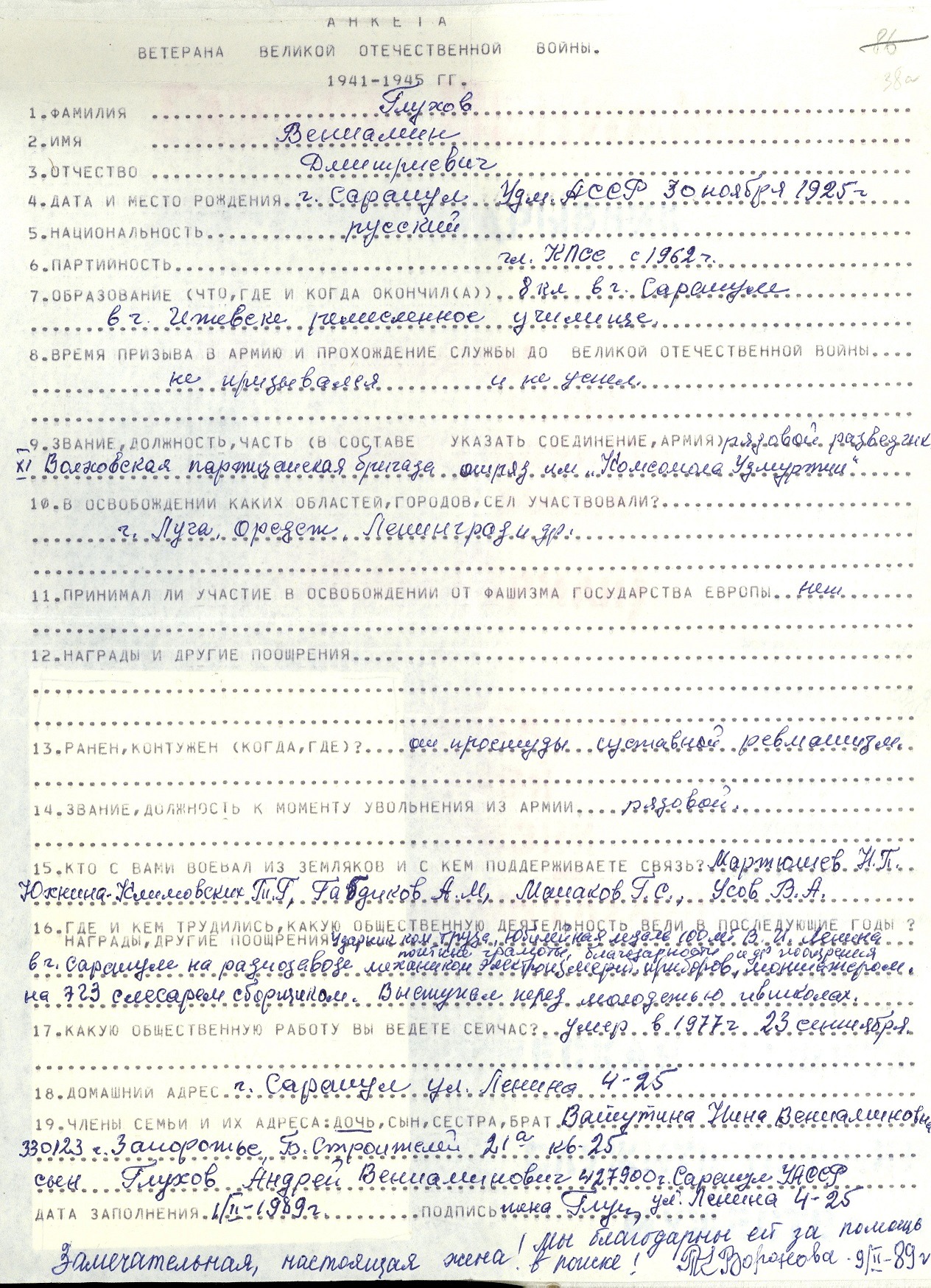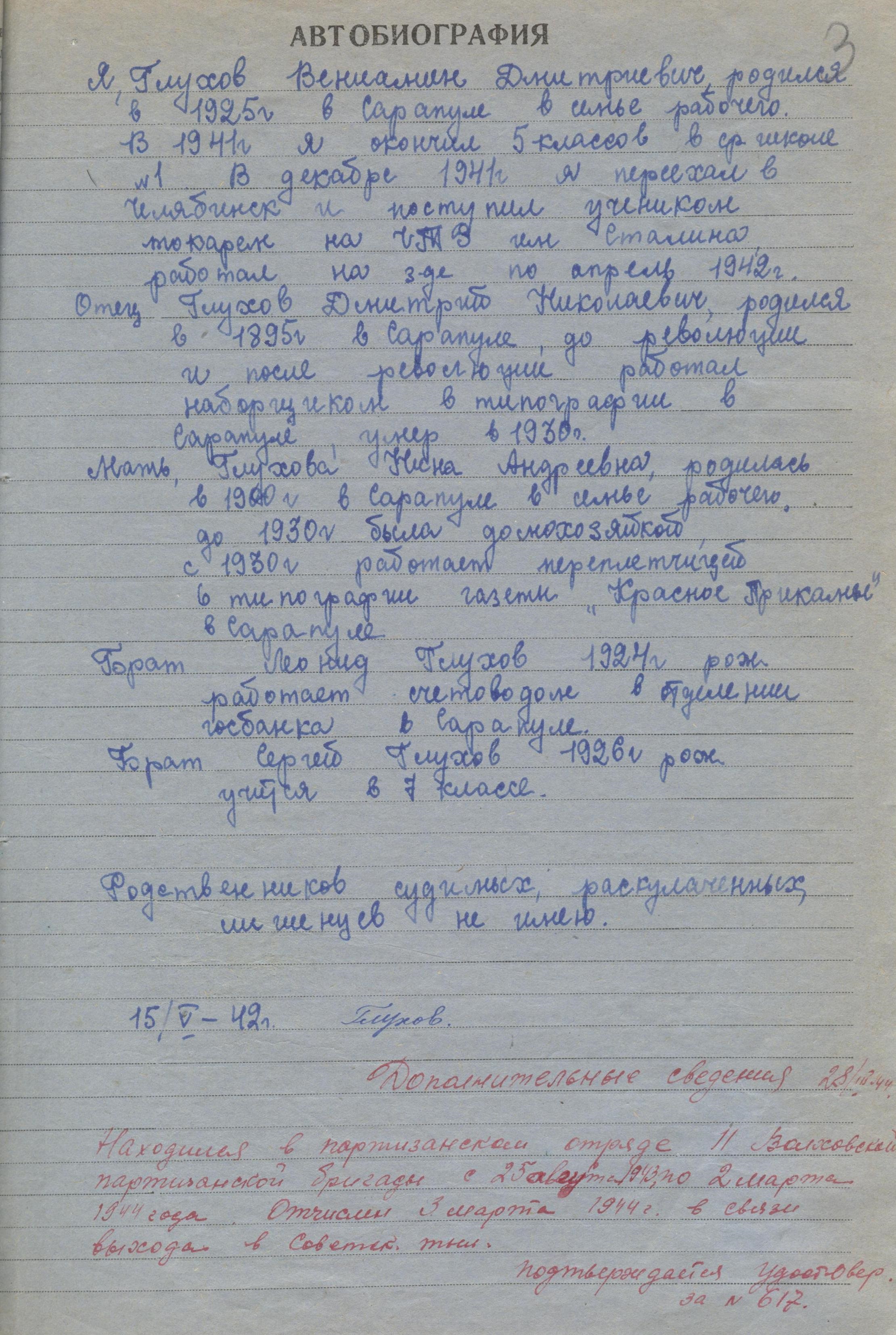 Уроженец г. Сарапула Глухов Вениамин Дмитриевич из семьи рабочих – отец и мать работали в типографии газеты «Красное Прикамье». В семье было ещё два брата – Леонид (1924 г.р.) и Сергей (1926 г.р.). В 1941 году Вениамин окончил пять классов средней школы № 1. В декабре 1941 года переехал в г. Челябинск и поступил учеником токаря на Челябинский тракторный завод им. Сталина. В мае 1942 года вернулся в Сарапул и был принят токарем на Сарапульский радиозавод. В августе 1943 года добровольцем ушёл в партизанский отряд им. Комсомола Удмуртии. Участвовал в освобождении г. Луги, ст. Оредеж, г. Ленинграда. Воевал до марта 1944 года.