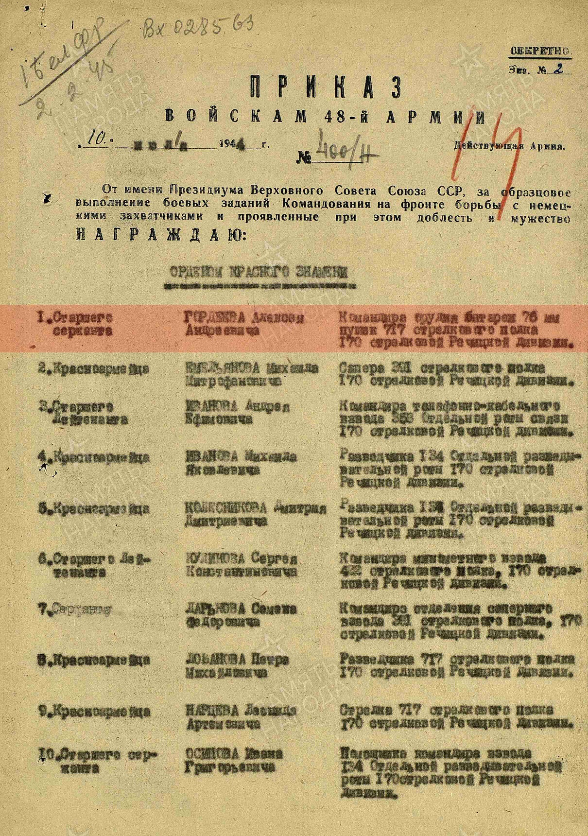 Место службы: 717 стрелковый полк, 170 Речицкая ордена Суворова стрелковая дивизия, 48 армия, 42 стрелковый корпус, Северо-Западный фронт, Центральный фронт, Белорусский фронт