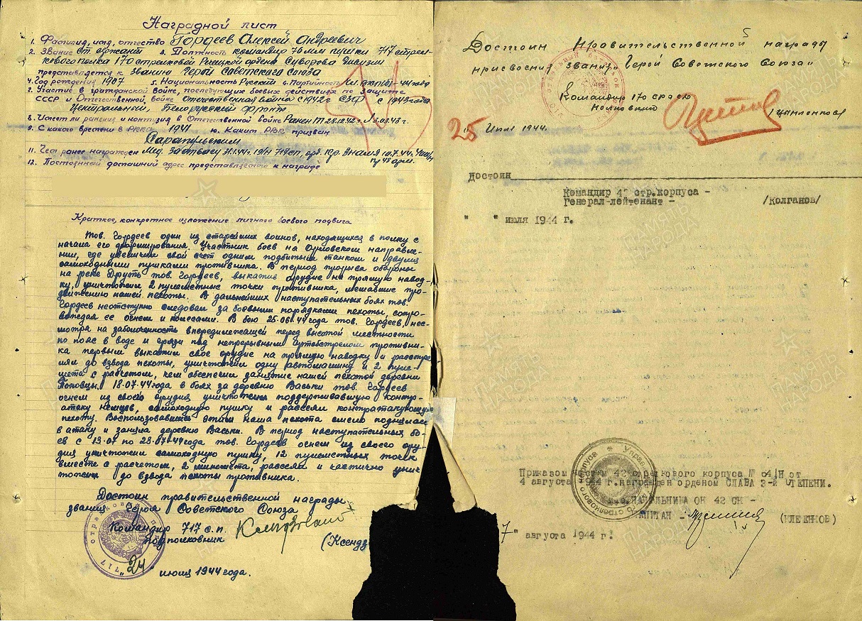Уроженец г. Сарапула Гордеев Алексей Андреевич в годы Великой Отечественной войны служил командиром орудия батареи 76‑мм пушек. Был дважды ранен – в декабре 1942 г. и в марте 1943 г. За проявленные мужество и героизм в июле 1944 г. был представлен к званию Героя Советского Союза, однако награда не была утверждена. Был награждён орденом Славы III степени.