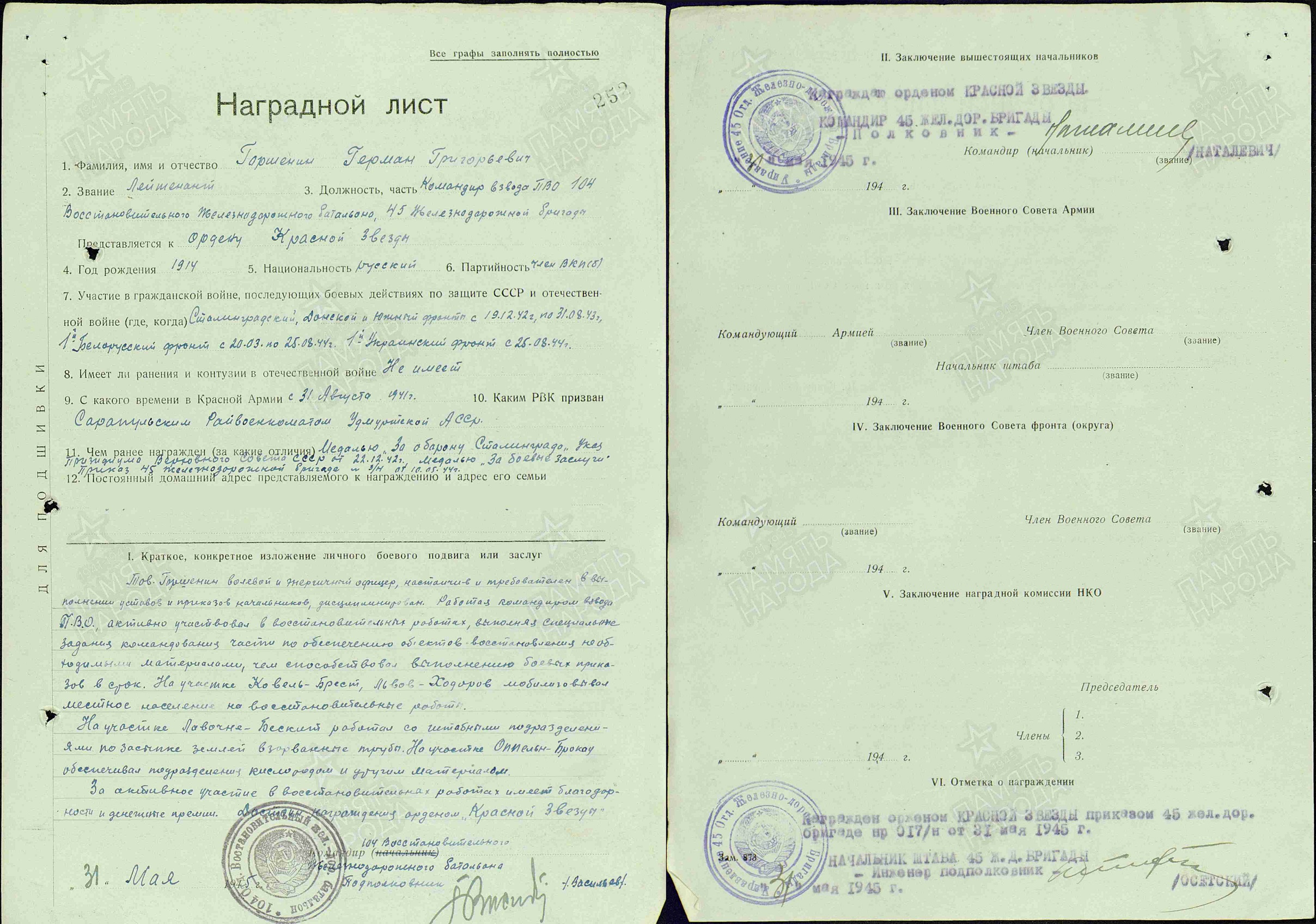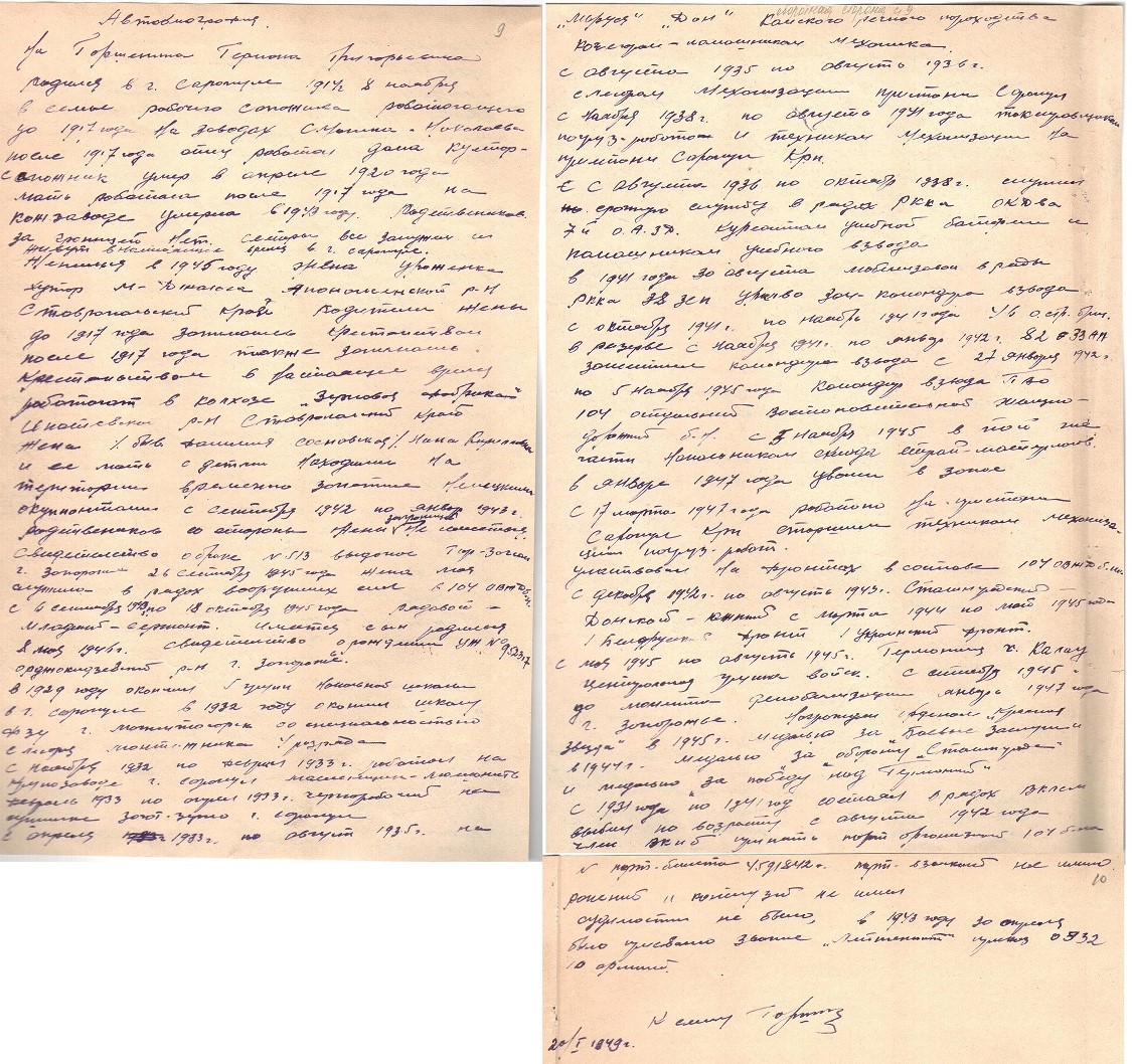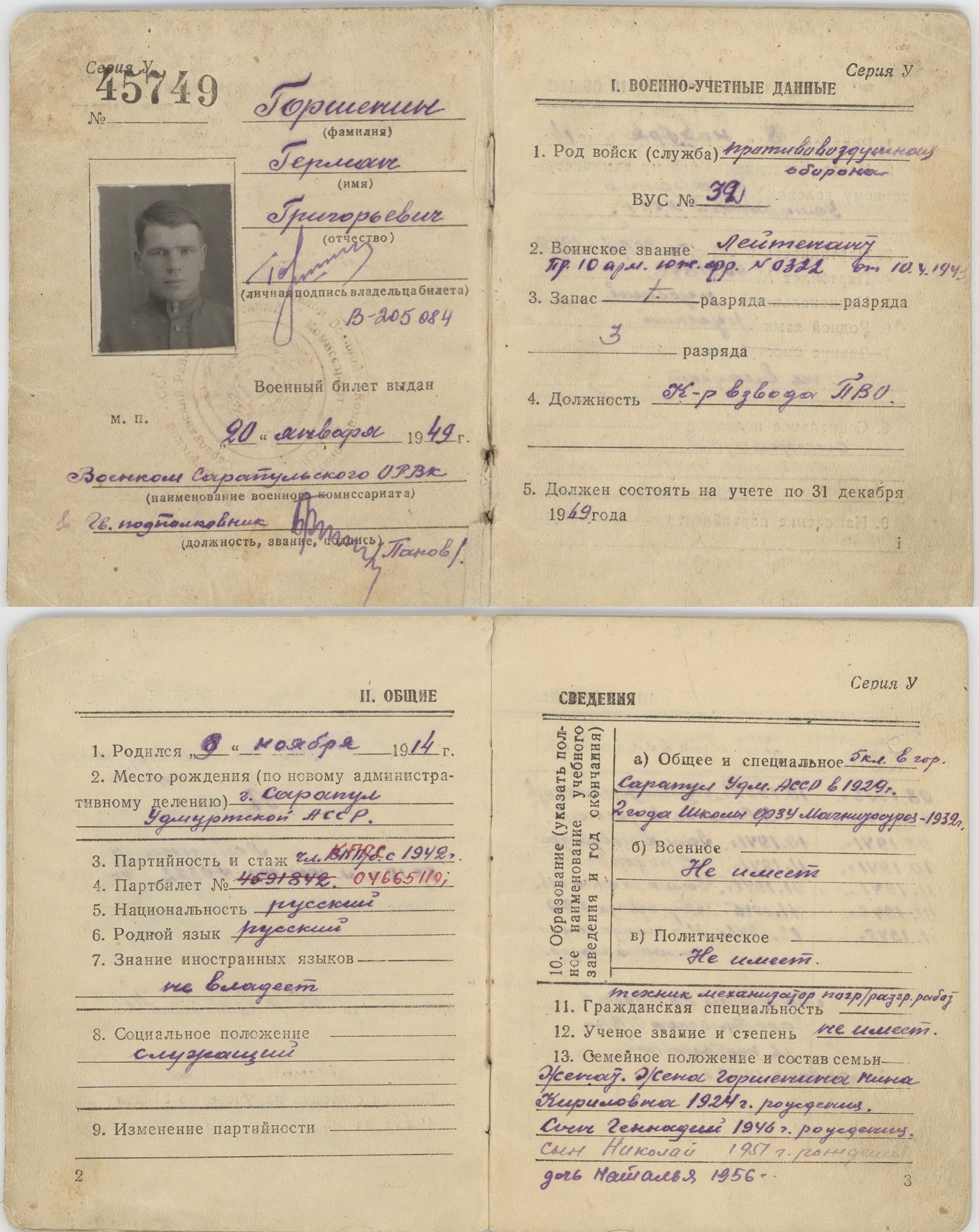 Уроженец г. Сарапула Горшенин Герман Григорьевич родился в семье сапожника. В 1929г. окончил начальную школу в Сарапуле, в 1932 г. – школу ФЗУ в Магнитогорске по специальности «слесарь-монтажник» 4 разряда. С 1933 г. до призыва в армию работал слесарем на пристани «Сарапул». Срочную службу проходил с августа 1936 по октябрь 1938 г. в составе 7-го отдельного зенитного артиллерийского дивизиона ОКДВА (Особая Краснознамённая Дальневосточная армия), курсантом учебной батареи и помощником командира учебного взвода.