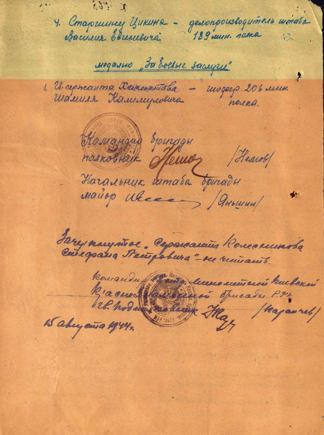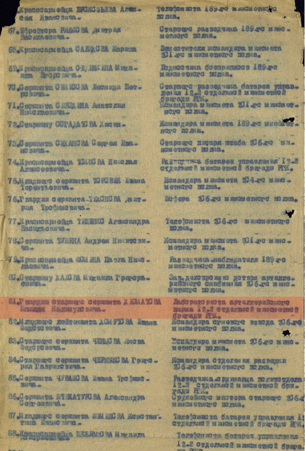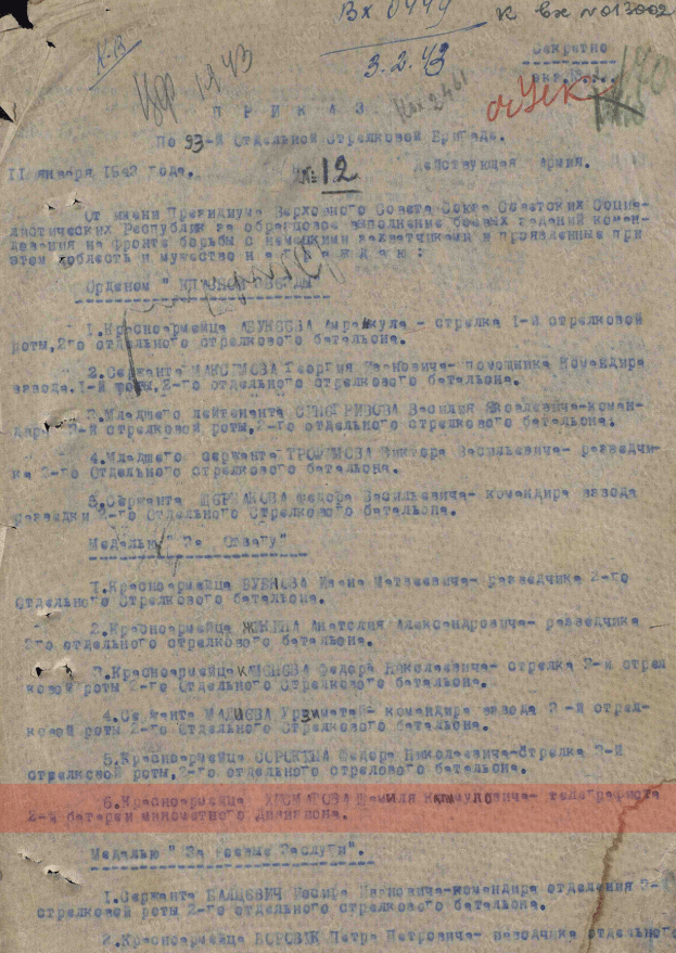 ЦАМО РФ. Ф. 33, оп. 682526, д.1024; оп. 690155, д. 2406; оп. 687572, д. 2417; оп.690306, д. 1187. Картотека награждений, № шкафа: 93, № ящика: 9.