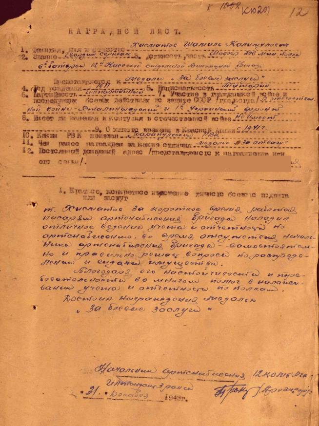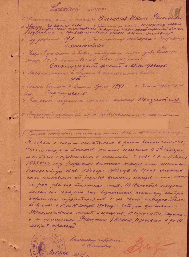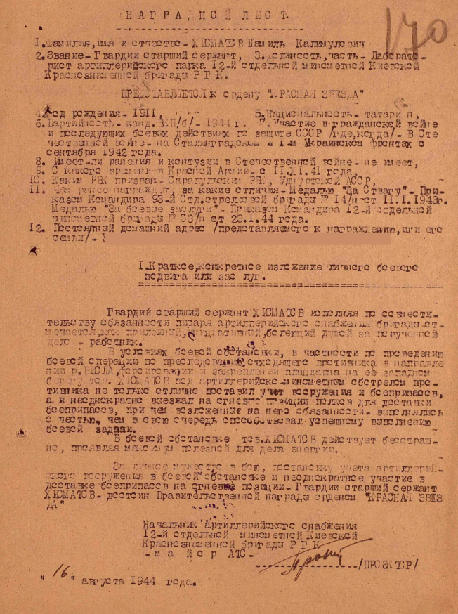 Уроженец г. Сарапула Хисматов Шамиль Калимулович в 1941 году был призван Сарапульским РВК в ряды РККА. На фронте с 1942 года. Воевал на Сталинградском и 1-м Украинском фронтах. За время войны побывал в разных должностях: шофёр, телеграфист – связист, лабораторист артпарка, писарь.  За отвагу и мужество награждён орденом и медалями. Из наградных листов: «В борьбе с немецкими захватчиками в районе высоты с отм. + 1,0 у Сталинграда, товарищ Хисматов работая связистом в 3-й батарее, не считался с трудностями и опасностью в боях с 10 по 17 января 1943 года под разрывами вражеских снарядов и мин обеспечивал бесперебойную связь. 11 января 1943 года во время яростных атак противника от разрывов вражеских снарядов и мин несколько раз рвалась телефонная линия. Хисматов Ш.К. немедленно налаживал связь, что дало возможность командиру батареи нормально корректировать огонь своей батареи. Только за время с 10 по 15 января 1943 года батарея уничтожила: 350 гитлеровских солдат и офицеров, 10 пулеметов, 2 пушки».