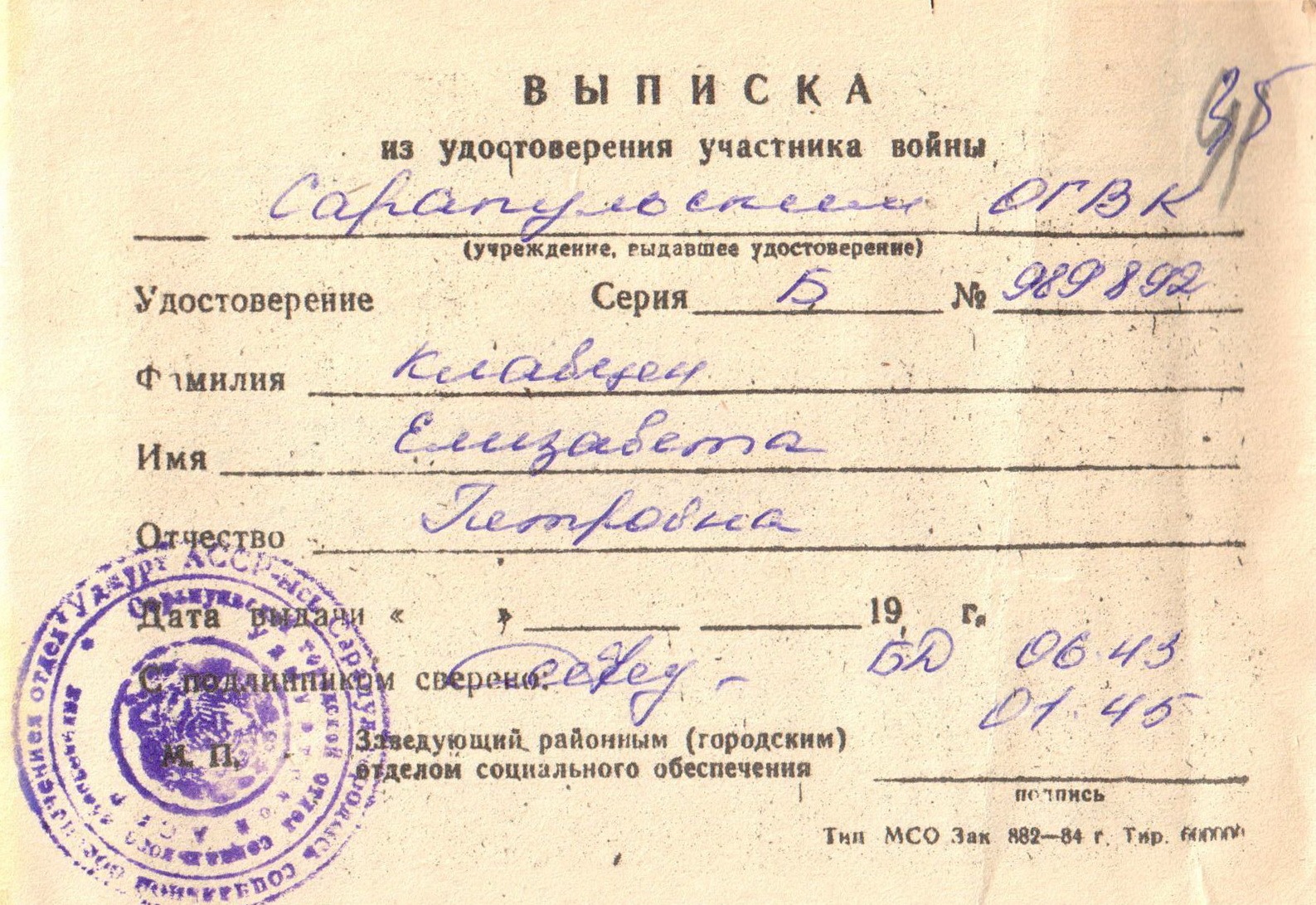 Уроженка г. Сарапула Клавцен Елизавета Петровна была призвана в ряды РККА в марте 1942 года. На фронтах Отечественной войны с июня 1943 по январь 1945 года. Служила телеграфисткой в 36-м отдельном батальоне связи.