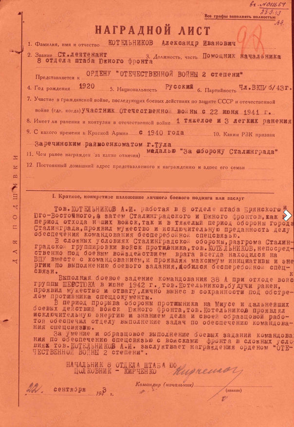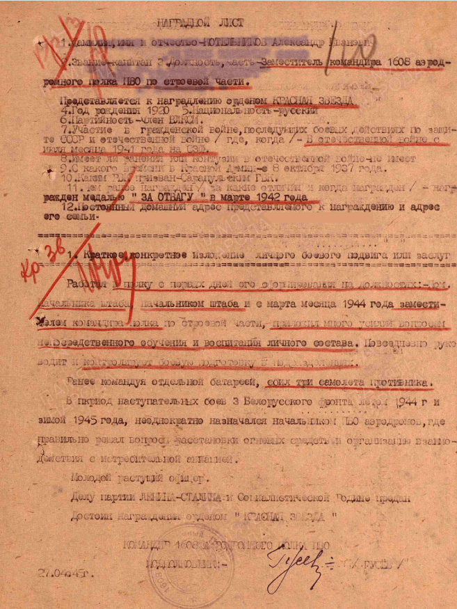 Из наградного листа: «Котельников А.И., работая в полку с первых дней его оформления на должностях: помощник начальника штаба, начальник штаба и с марта 1944 года заместитель командира полка по строевой части, приложил много усилий вопросам непосредственного обучения и воспитания личного состава. Повседневно руководит и контролирует боевую подготовку в подразделениях. Ранее, командуя отдельной батареей, сбил три самолета противника. В период наступательных боев 3-го Белорусского фронта летом 1944 года и зимой 1945 года неоднократно назначался начальником противовоздушной обороны аэродромов, где правильно решал вопросы расстановки огневых средств и организацию взаимодействия с истребительной авиацией».