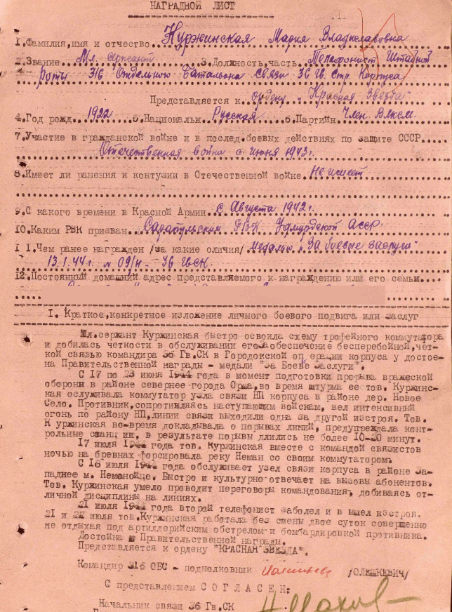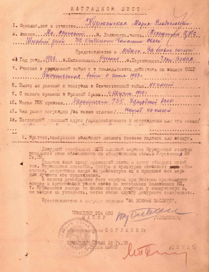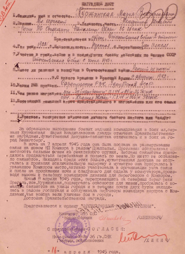 Уроженка г. Сарапула Куржинская (девичья фамилия) Мария Владиславовна после окончания 9 классов в 1942 году была вызвана с одноклассниками в горком комсомола, где им предложили добровольцами, по комсомольской путёвке, отправиться на фронт.