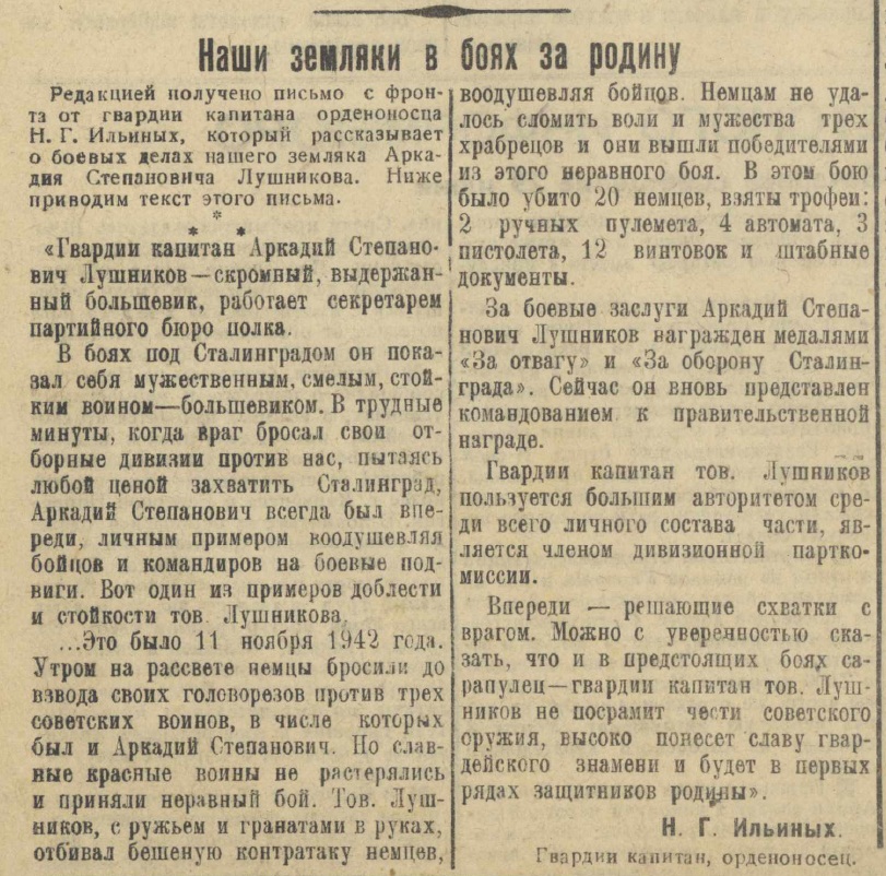 Уроженец города Сарапула Лушников Аркадий Степанович принимал участие в Гражданской войне на Юго-Восточном фронте. После войны работал заведующим военным отделом Сарапульского ГК ВКП (б). В начале Великой Отечественной войны занимался размещением заводов, эвакуированных из Баку и Москвы. В ноябре 1942 г. был мобилизован. В качестве комиссара полка участвовал в обороне Сталинграда. Под Курском получил ранение. Награждён медалями «За отвагу», «За оборону Сталинграда», орденом Красной Звезды.