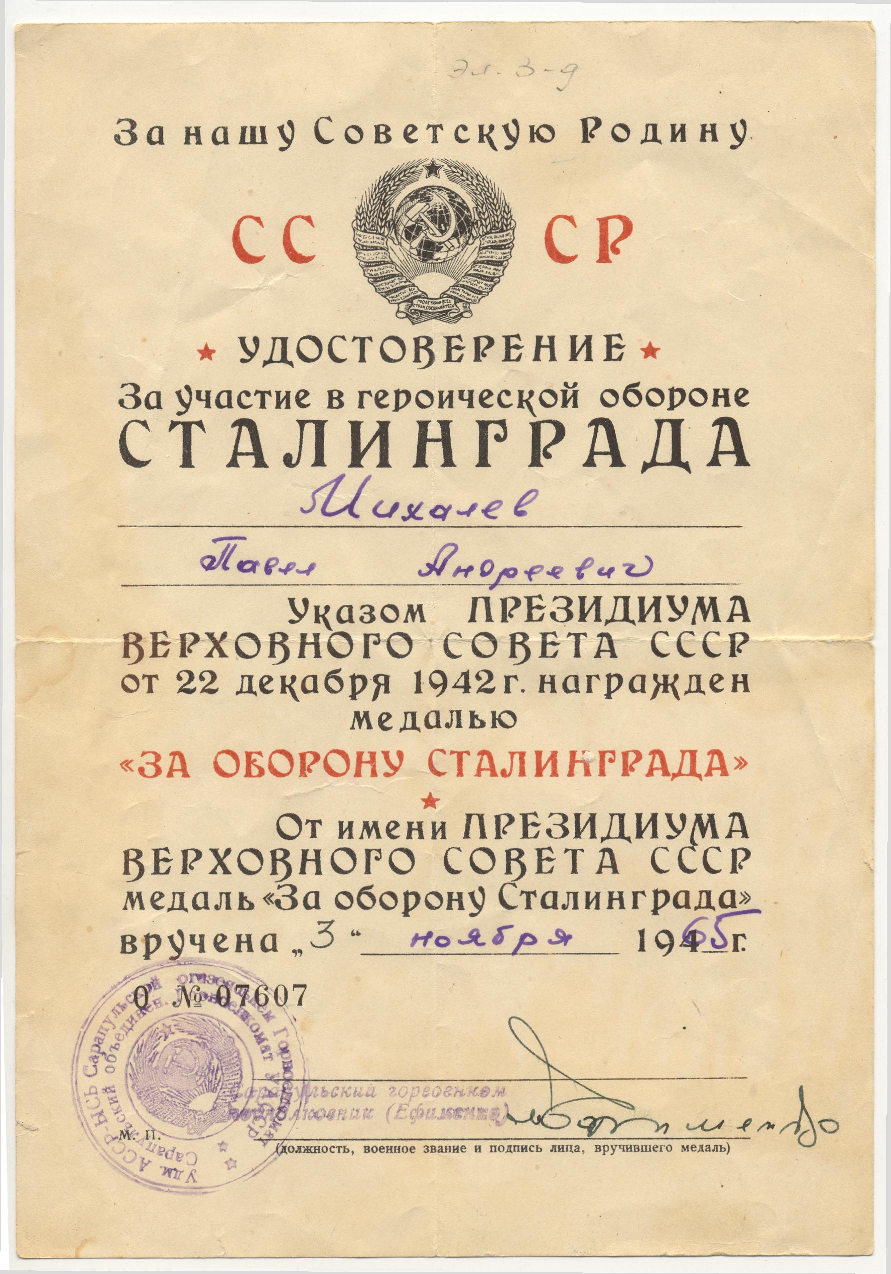 Награды: медаль «За оборону Сталинграда» (Указ Президиума ВС СССР от 03.11.1965), медаль «За победу над Германией в Великой Отечественной войне 1941-1945гг.»