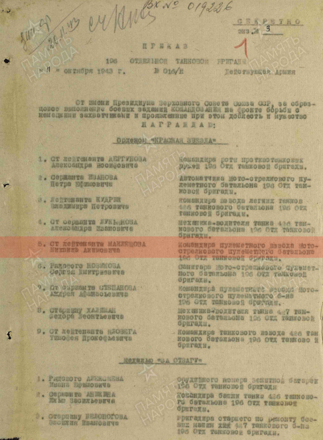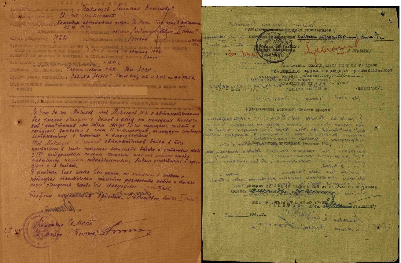 ЦАМО РФ. Ф. 33, оп. 690155, д. 3924; оп. 682526, д. 1317. Ф. 3134, оп. 2, д. 70. Картотека награждений, № шкафа: 54, № ящика: 9.