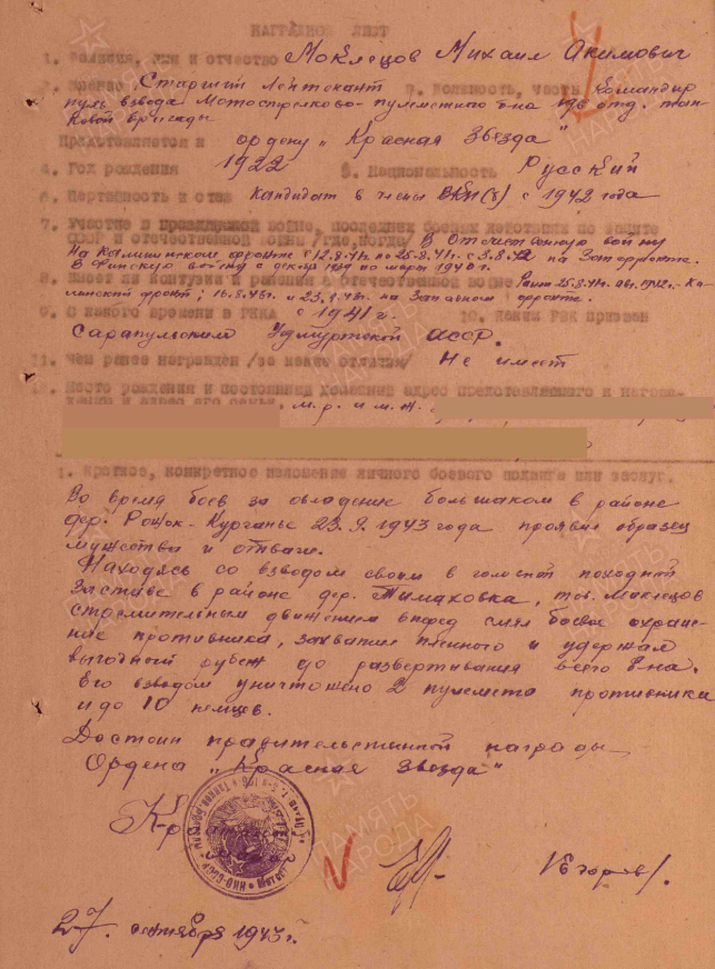 Информация по документам ГИС «Память народа», ОБД «Подвиг народа», электронного архива «Удмуртия для Победы», из книги «Страну заслонили собой» / авторы – составители О. Калинина, Ю. Шавкунов. – Ижевск: Удмуртия, 2010. – С. 278-279.