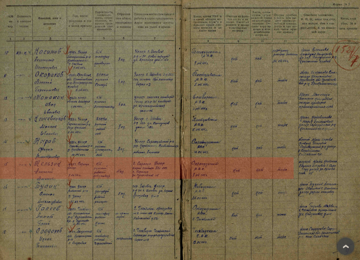 Уроженец г. Сарапула Нельзин Анатолий Васильевич до войны окончил 4 класса средней школы, работал в стройконторе 36с завода № 203, в должности штукатура. В апреле 1944 года был мобилизован на фронт. Участвовал в боях с немецкими захватчиками с апреля 1944 по январь 1945 года. Служил в нескольких стрелковых полках, дивизиях. Был ранен, после лечения признан негодным к строевой службе и демобилизован в июне 1945 года.