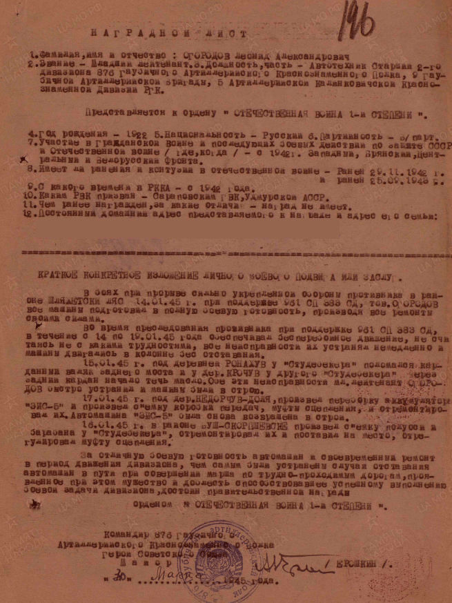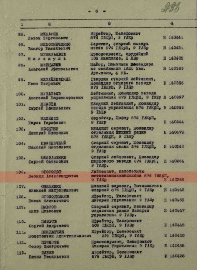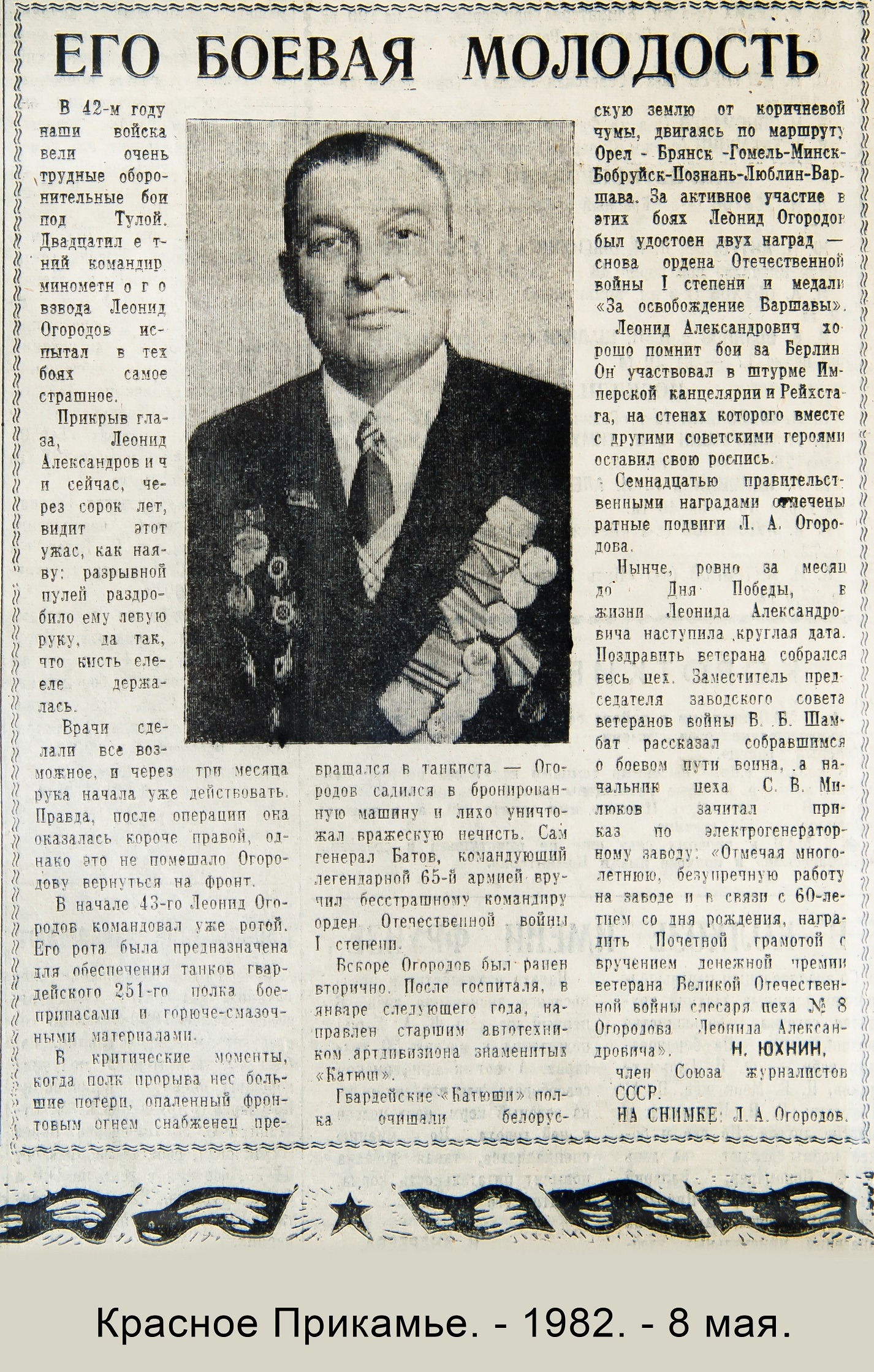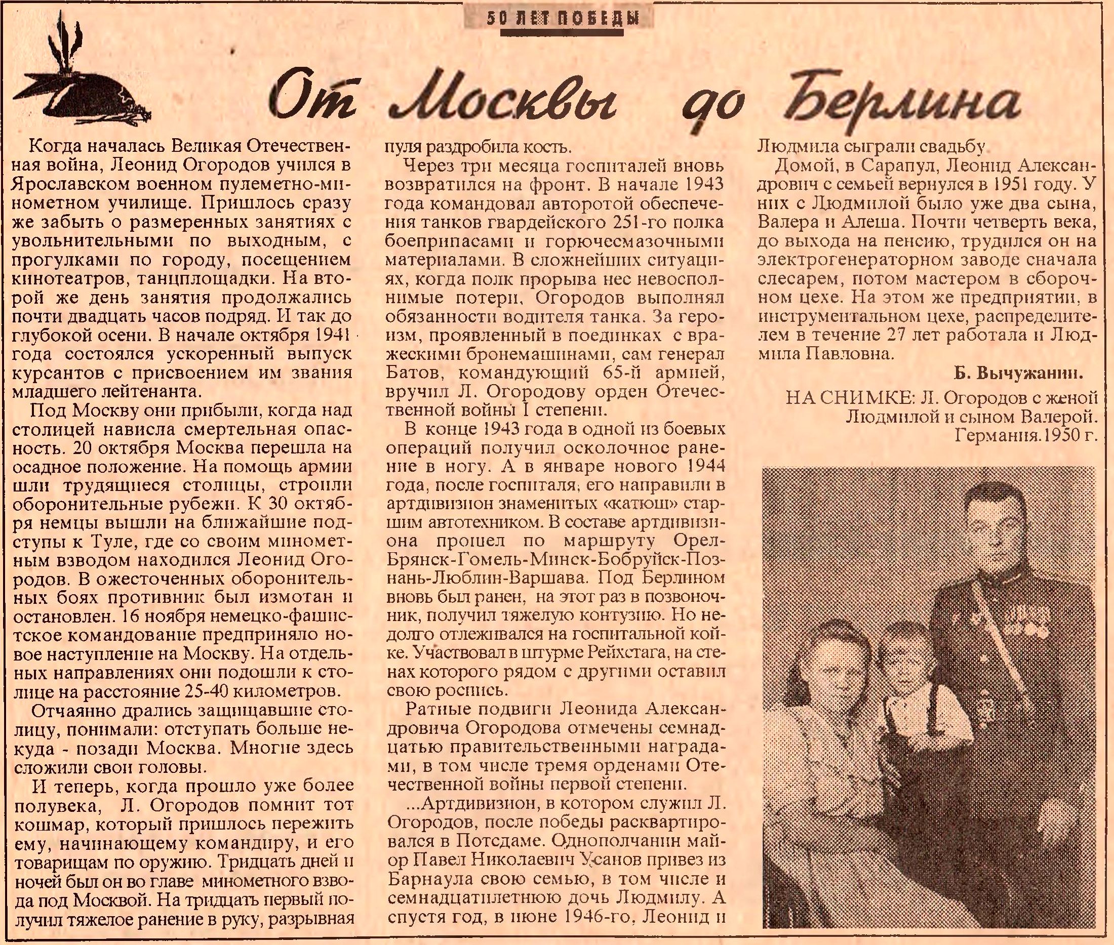 Уроженец г. Сарапула Огородов Леонид Александрович в 1936 году окончил 6 классов. В 1937 году поступил работать на ликёроводочный завод учеником слесаря. С 1941 года работал шофёром, а затем заведующим гаражом. В марте 1942 года был призван в ряды РККА и зачислен в Ярославское пулемётно-миномётное училище. После окончания училища 15 сентября 1942 года был отправлен на фронт в действующую армию, где находился до окончания Великой Отечественной войны. Был командиром миномётного взвода. Воевал на Западном, Брянском, Центральном, Белорусском фронтах. 29 ноября 1942 года Леониду Огородову разрывной пулей раздробило левую руку. Врачи спасли её, и Леонид Александрович вернулся в строй. Освобождал от врага города: Мценск, Орёл, Курачев, Брянск, Новозыбков, Гомель, Мозырь, Бобруйск.