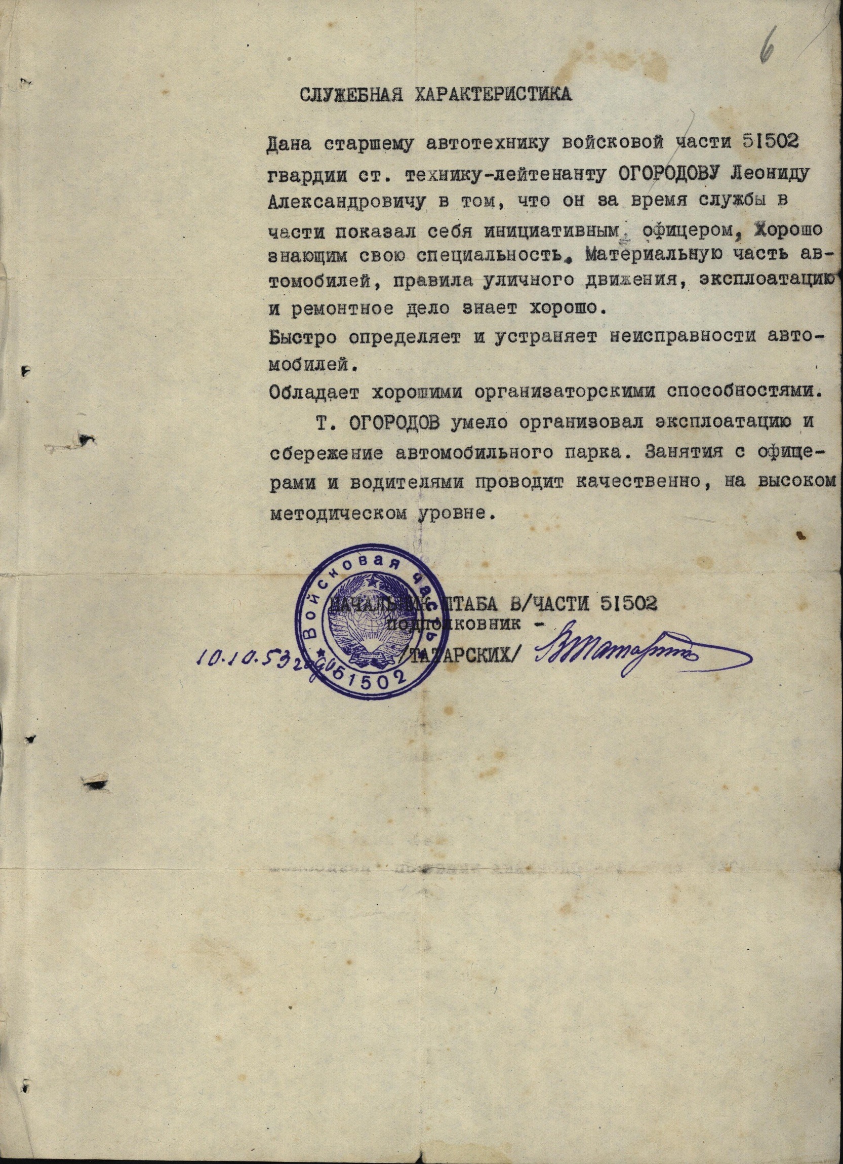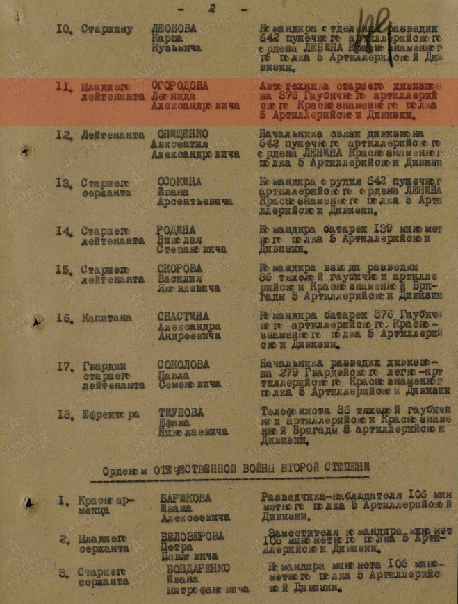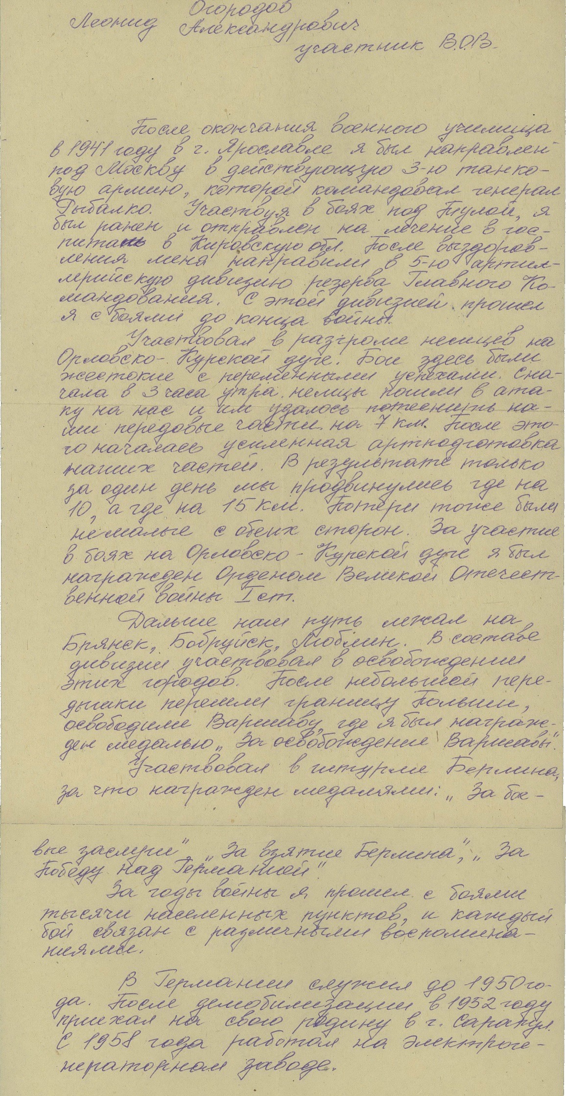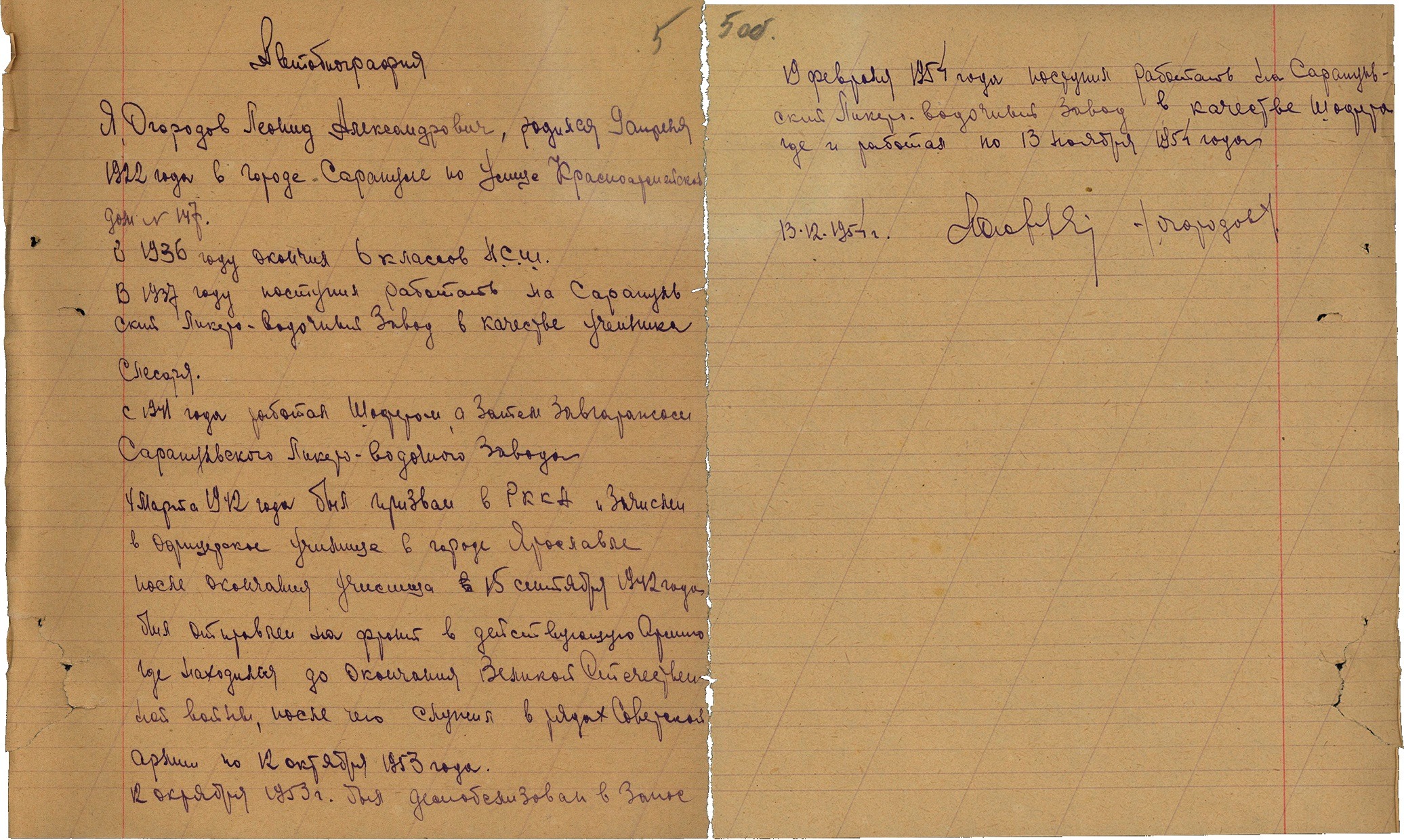 Уроженец г. Сарапула Огородов Леонид Александрович в 1936 году окончил 6 классов. В 1937 году поступил работать на ликёроводочный завод учеником слесаря. С 1941 года работал шофёром, а затем заведующим гаражом. В марте 1942 года был призван в ряды РККА и зачислен в Ярославское пулемётно-миномётное училище. После окончания училища 15 сентября 1942 года был отправлен на фронт в действующую армию, где находился до окончания Великой Отечественной войны. Был командиром миномётного взвода. Воевал на Западном, Брянском, Центральном, Белорусском фронтах. 29 ноября 1942 года Леониду Огородову разрывной пулей раздробило левую руку. Врачи спасли её, и Леонид Александрович вернулся в строй. Освобождал от врага города: Мценск, Орёл, Курачев, Брянск, Новозыбков, Гомель, Мозырь, Бобруйск.