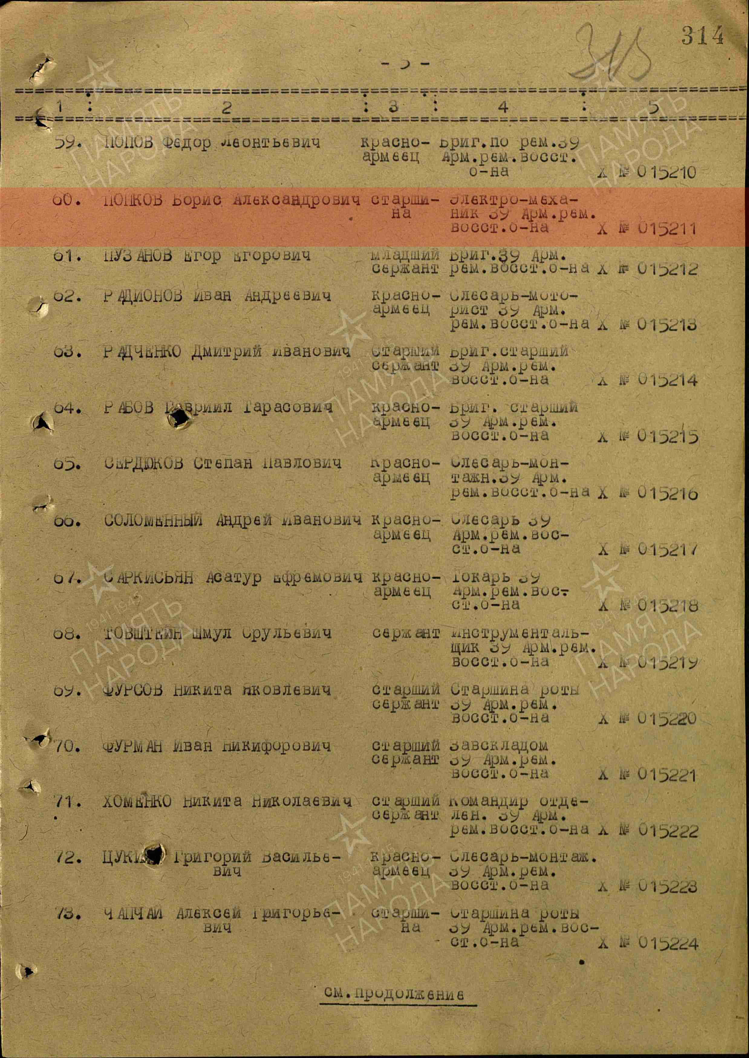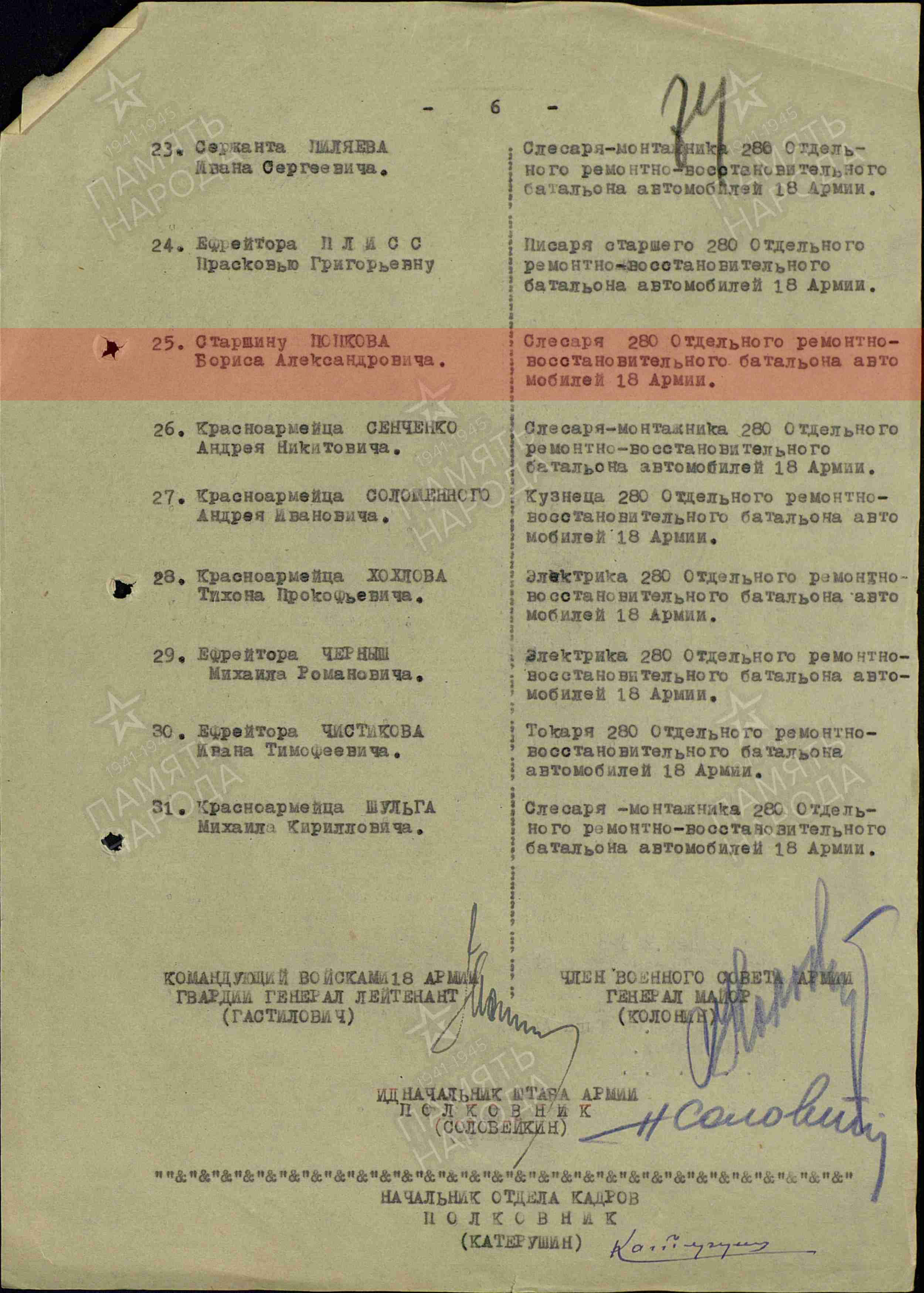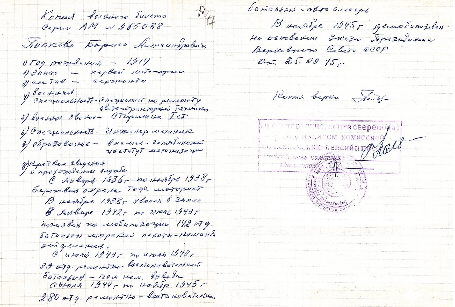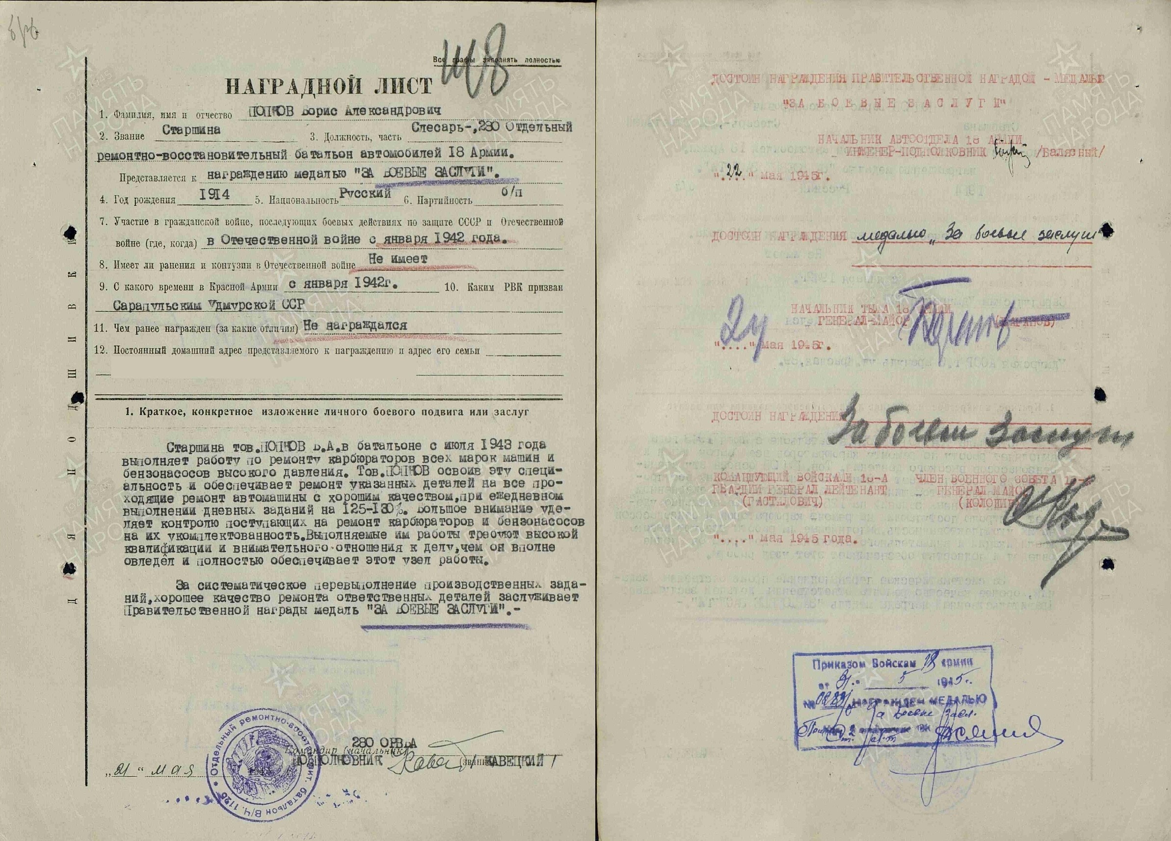 Уроженец г. Сарапула Попков Борис Александрович с января 1936 по ноябрь 1938 года проходил срочную службу в рядах РККА. С ноября 1939 по май 1940 года работал прорабом в Сарапульской стройконторе. С июня 1940 по январь 1942 года работал инструктором по ремонту в Сарапульской школе механизации. В январе 1942 года был мобилизован на фронт. В должности командира отделения воевал в составе 142-го отдельного батальона морской пехоты. Принимал участие в битве за Кавказ.