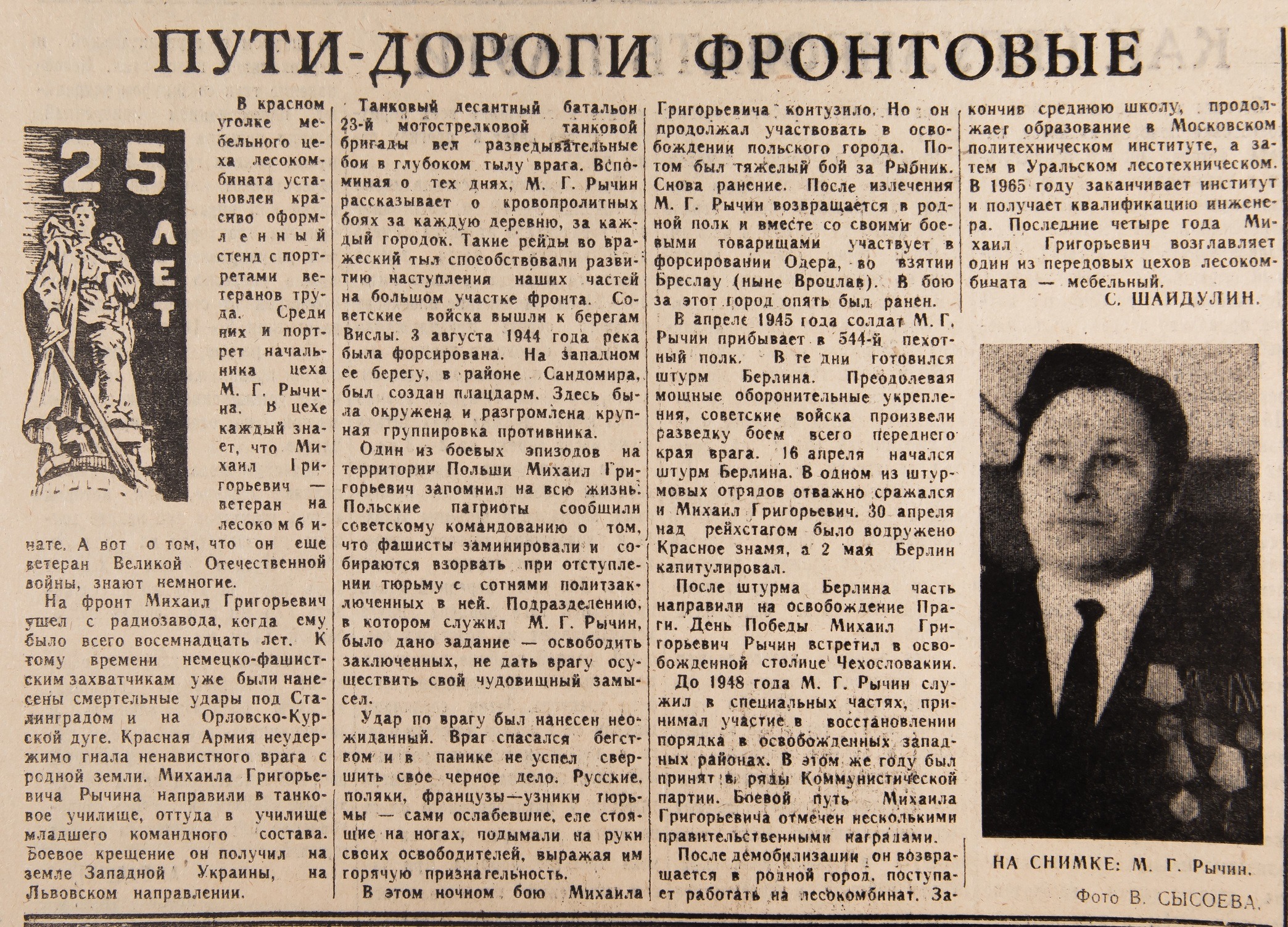 Рычин Михаил Григорьевич родился 18 января 1925 года в Сарпуле. Окончил 8 классов, работал токарем на радиозаводе. На фронт ушел добровольцем в 18 лет. Его направили в танковое училище младшего командного состава. Боевое крещение получил на земле Западной Украины, на Львовском направлении. На Сандомирском плацдарме шли ожесточенные бои. Перелом в пользу наших войск внесли танковые подразделения под командованием генерала Рыбалко. В этих боях отличился и экипаж танка, в котором находился Михаил Рычин. 8 февраля 1945 г. получил контузию и ранение. После лечения снова вернулся в строй. Участвовал во взятии Берлина. Затем танковая часть была направлена на освобождение Праги. Там Михаил Григорьевич и закончил войну. Но впереди были еще три года службы. До 1948 года служил в специальных частях, принимал участие в восстановлении порядка в освобожденных западных районах.