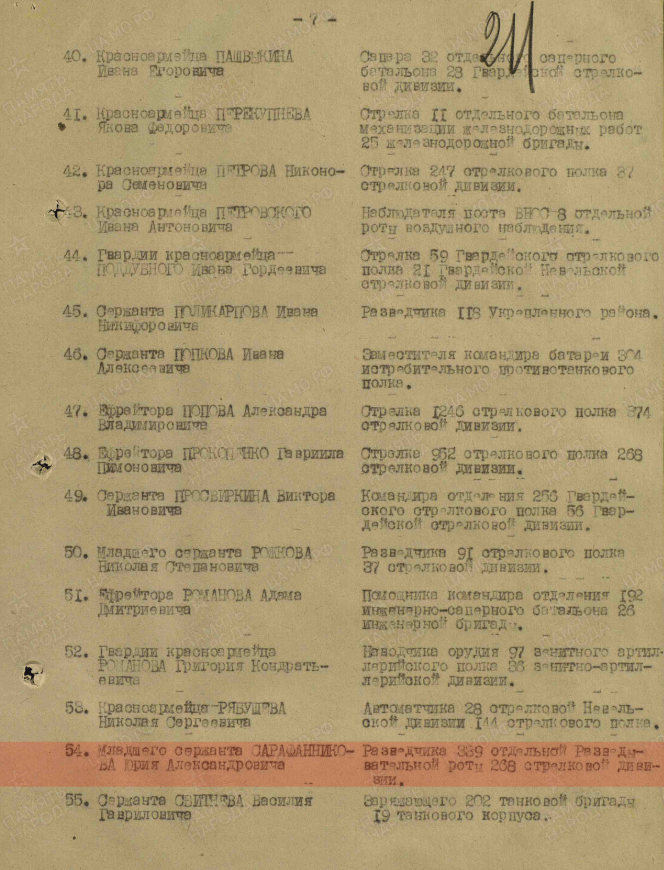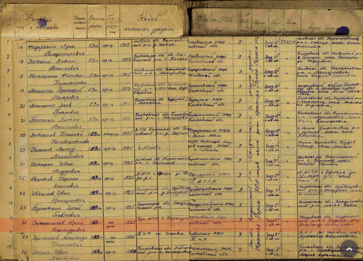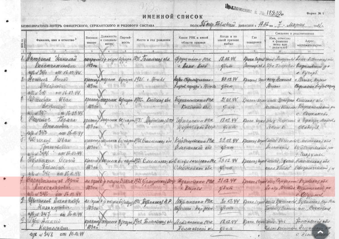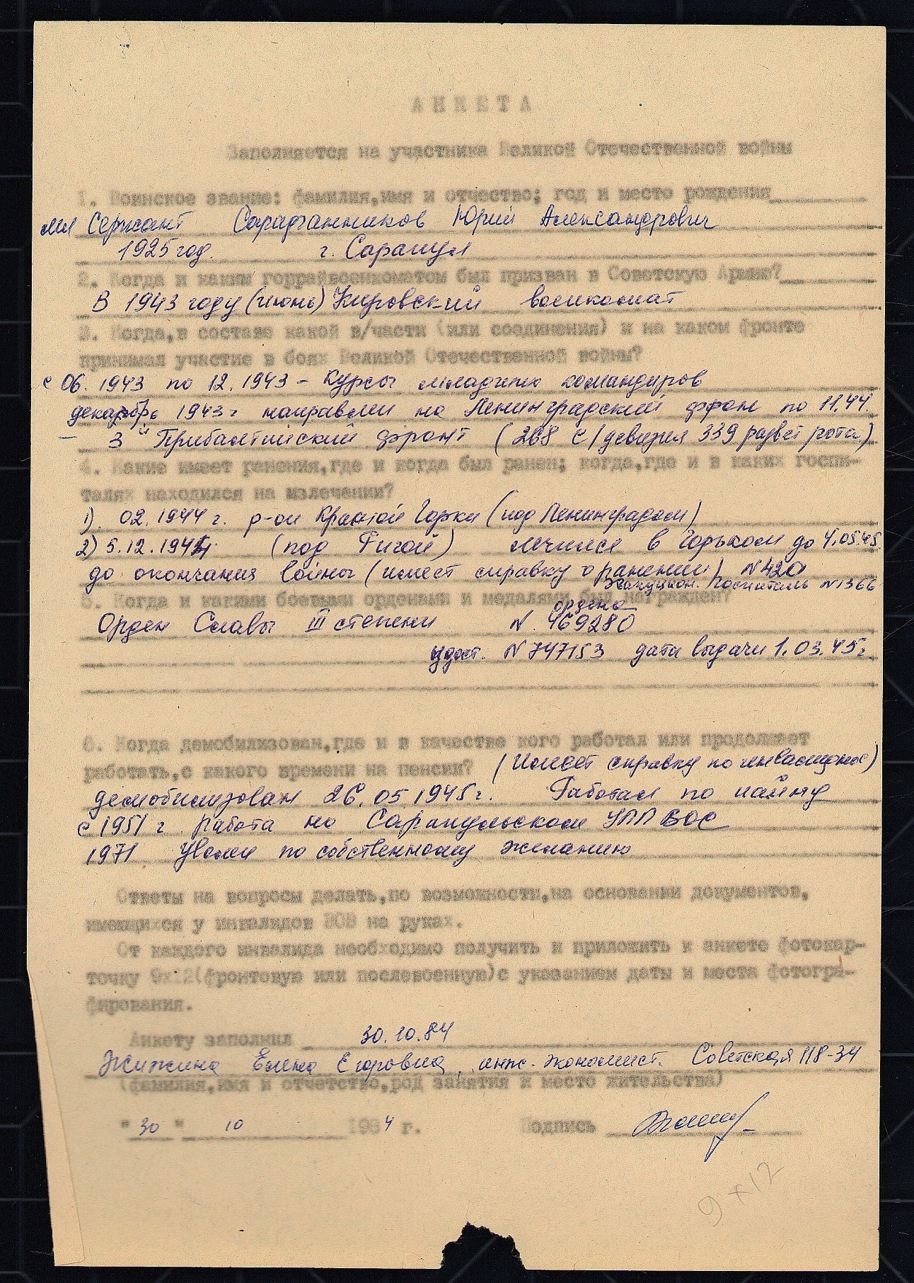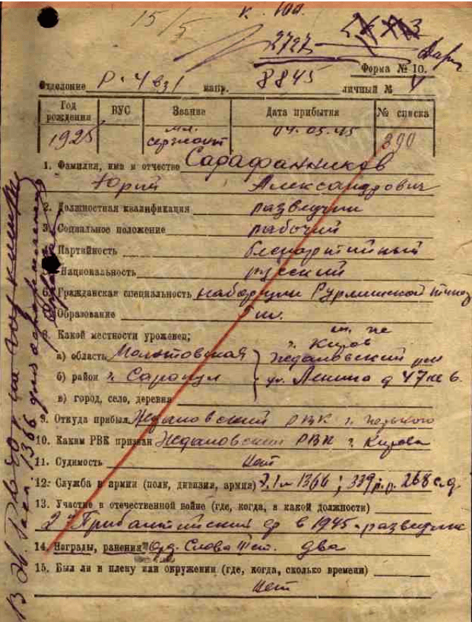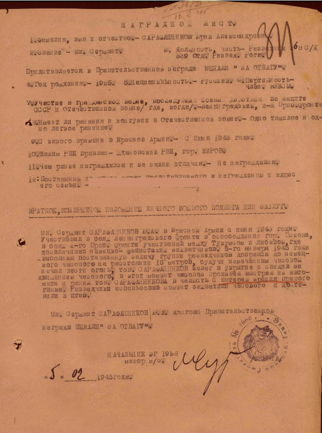 Уроженец г Сарапула Сарафанников Юрий Александрович в июне 1943 года был призван Ждановским РВК г. Кирова в ряды РККА. С июня по декабрь 1943 года прошёл курсы младших командиров. В декабре 1943 года в составе 339-й разведывательной роты, 268-й стрелковой дивизии был направлен на Ленинградский фронт, где воевал по ноябрь 1944 года. Воевал на 2-м и 3-м Прибалтийском фронтах. Был дважды ранен. Первое лёгкое ранение получил в феврале 1944 года под Ленинградом в районе Красной Горки. Второе – под Ригой 5 января 1945 года – тяжелое: ранение в челюсть, потеря зрения правого глаза. Лечился в эвакогоспитале № 1366 в г. Горький до мая 1945 года.