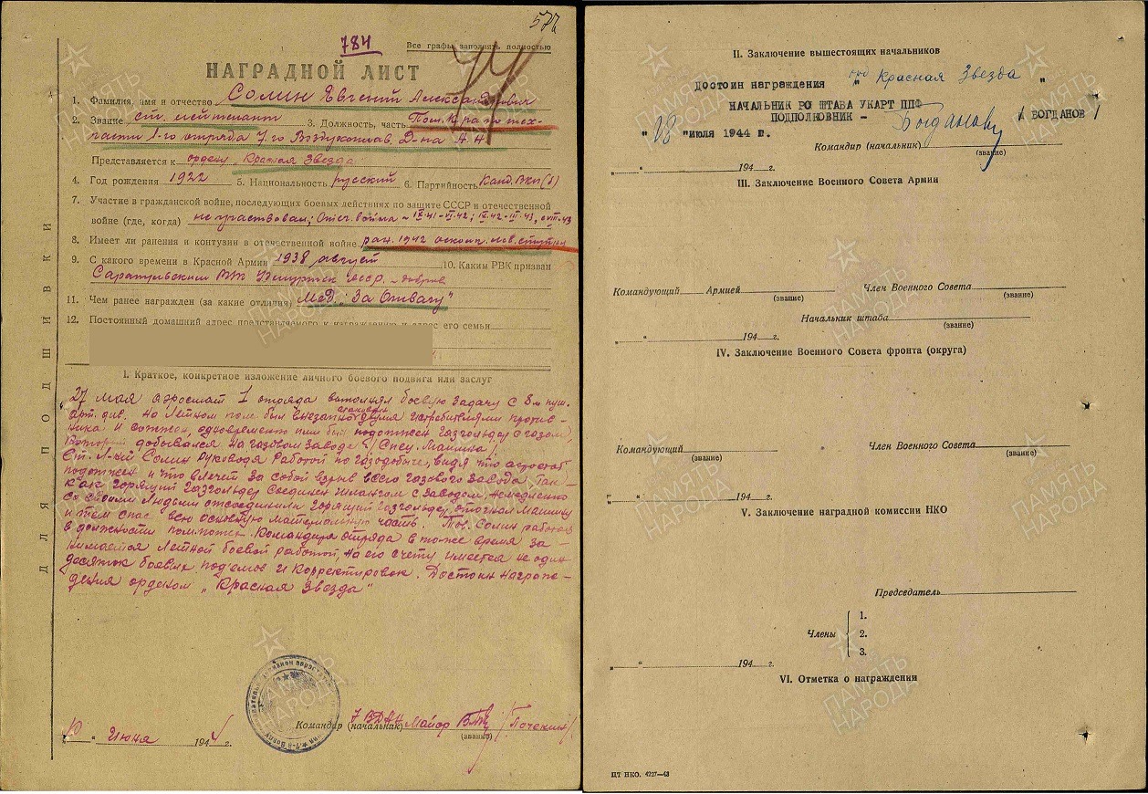 ЦАМО РФ. Ф. 33, оп. 690155, д. 4685; оп. 686044, д.1249. Картотека награждений, № шкафа: 81, № ящика: 20.