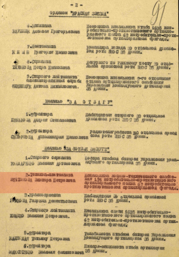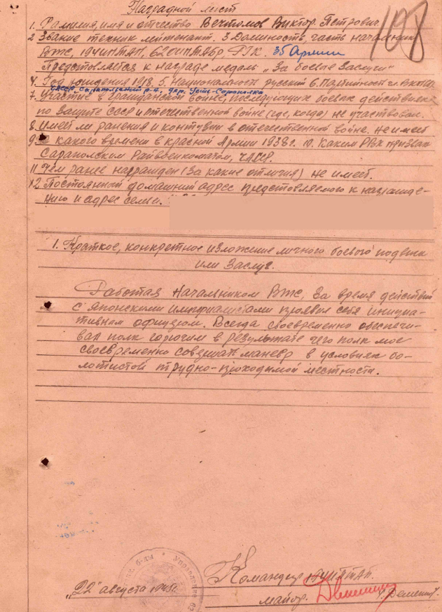 Место службы: 194 истребительно-противотанковый артиллерийский полк, 62 истребительно-противотанковая артиллерийская бригада, Дальневосточный фронт, 35 армия