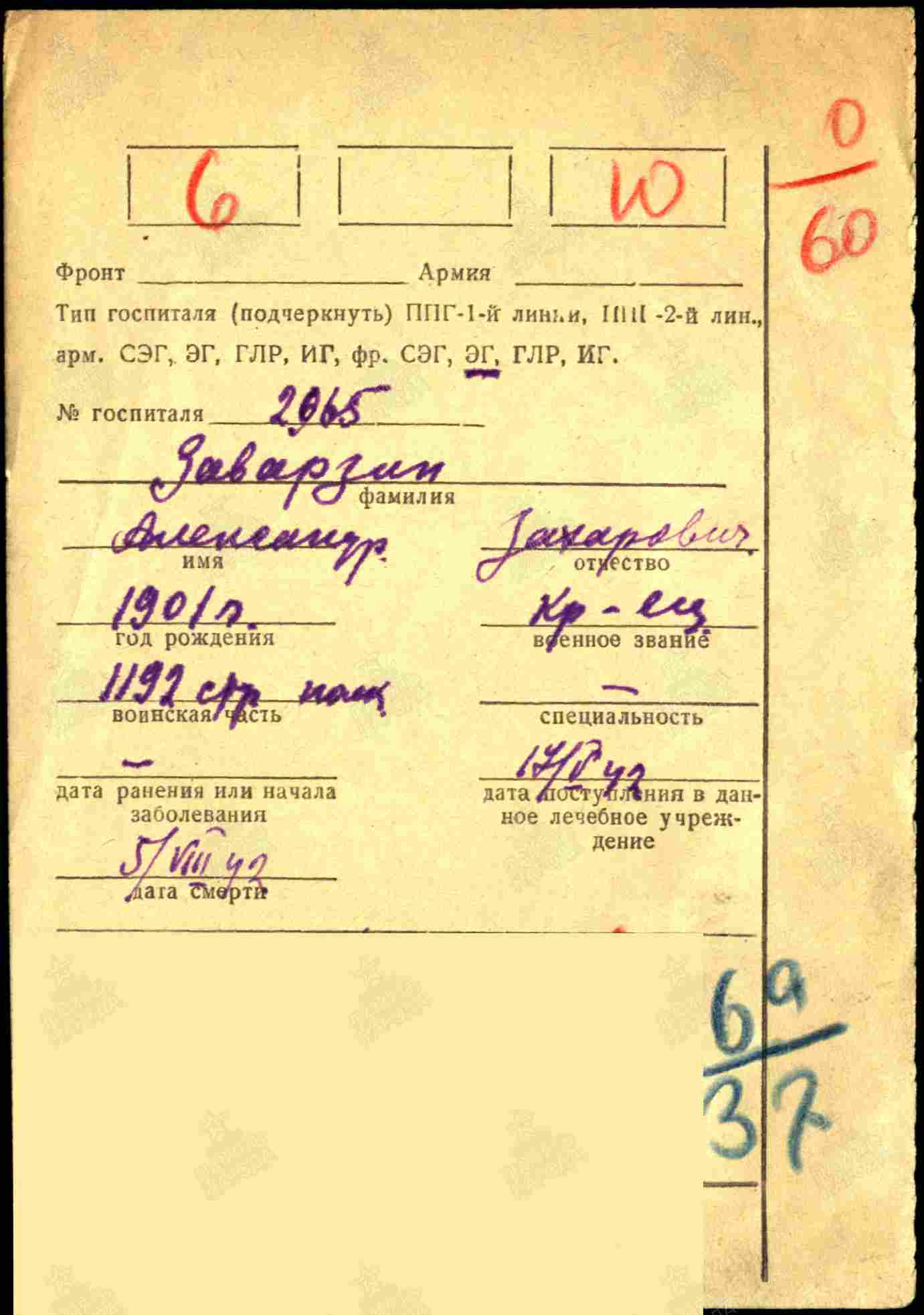 Филиал ЦАМО (военно-медицинских документов). Ф. Картотека общего учета, № шкафа: Завототинский Захар Б — Заворыкин Яков Ив, № ящика: 079-16. Ф. Картотека ранений.