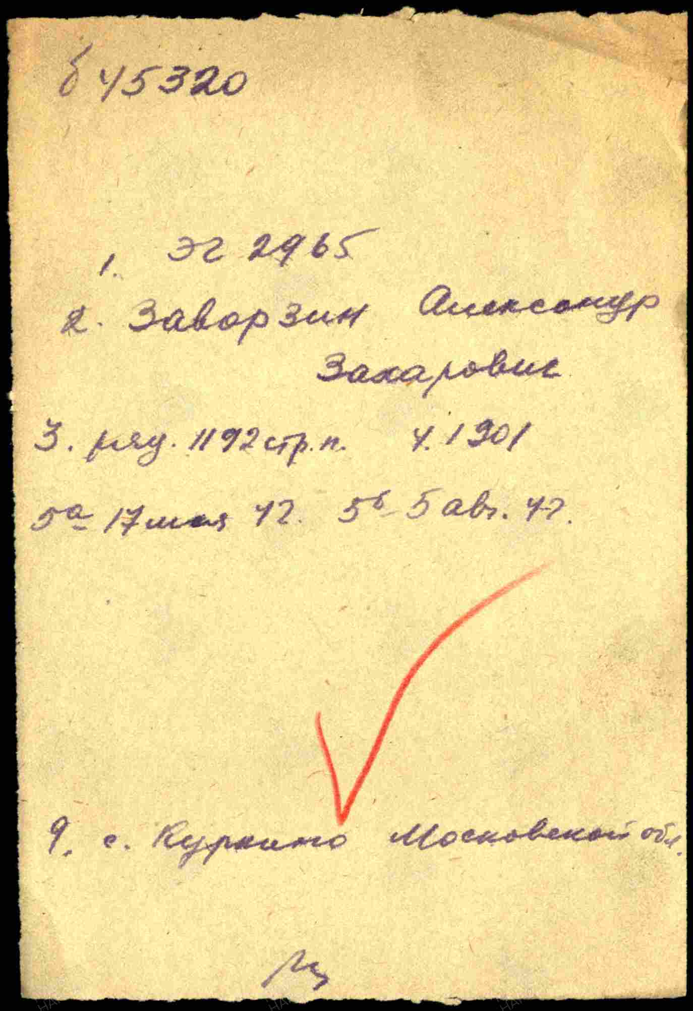 Место захоронения: Московская обл., Химкинский р-н, Куркинский с/с, с. Куркино, могила № 46
